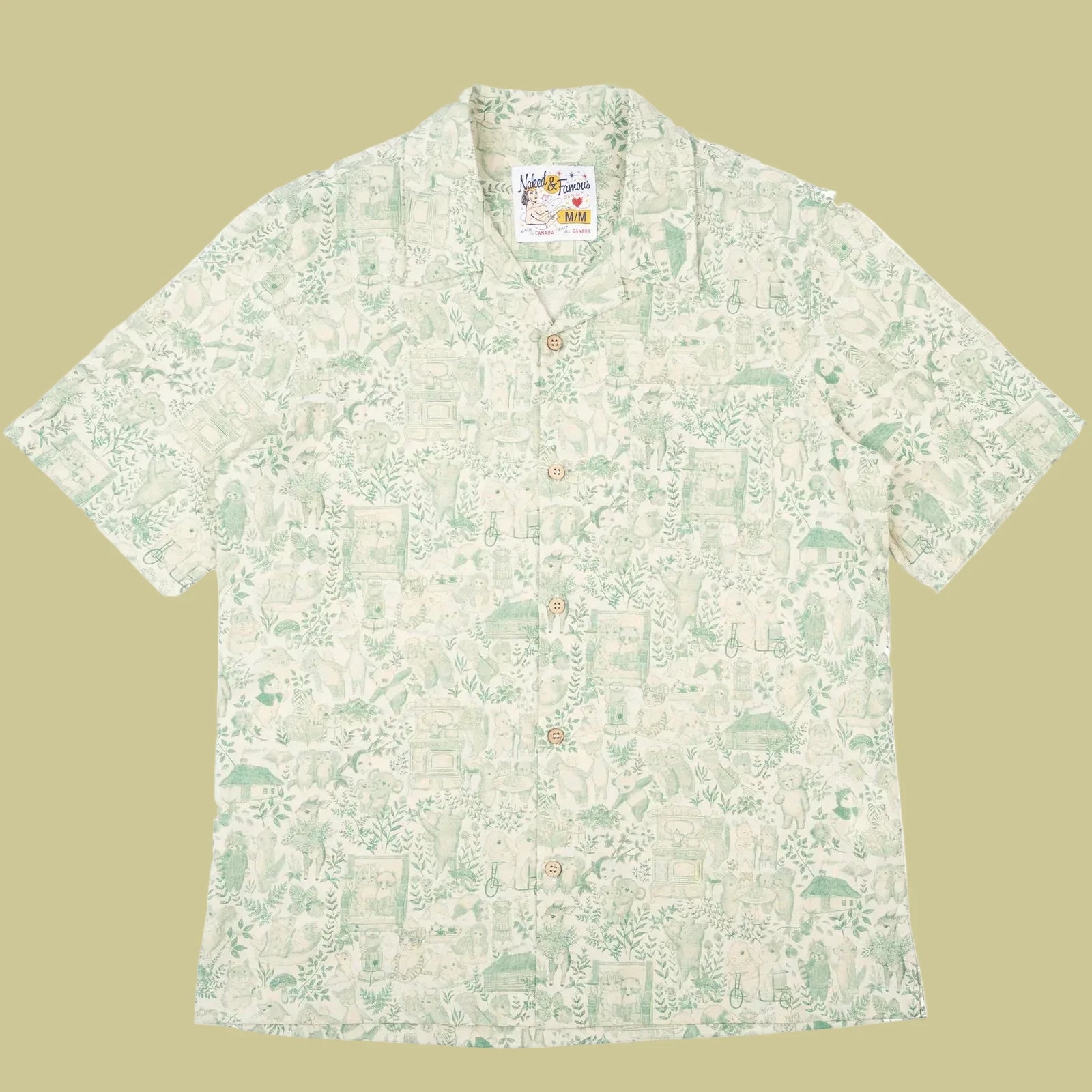 The Aloha Shirt is a short-sleeve shirt with a boxy silhouette, a chest pocket, and a camp collar. Cut and sewn in Canada. Finished with coconut buttons.