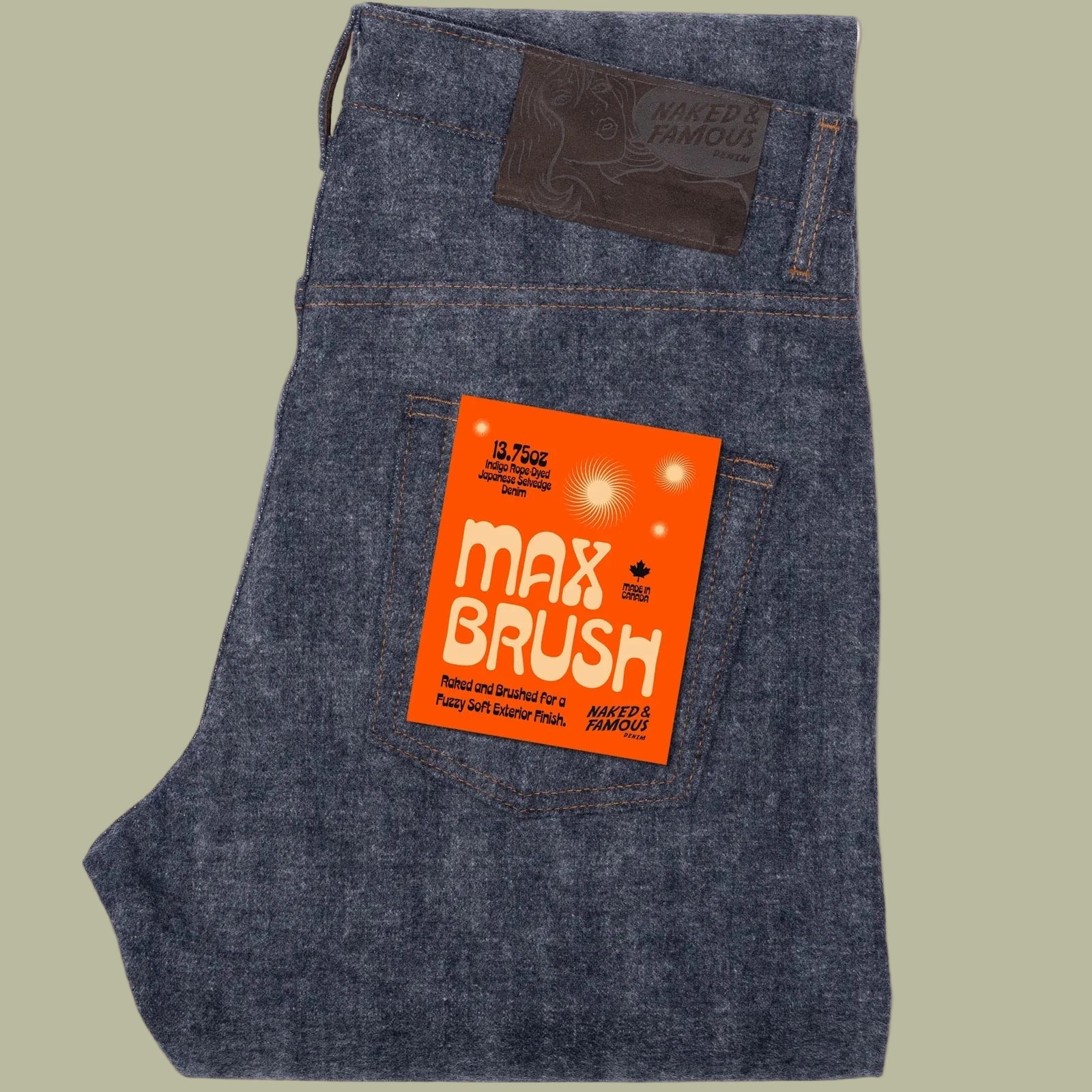 The Max Brush Selvedge is a 13.75oz Japanese selvedge denim designed for unparalleled softness and comfort. The exceptional softness comes from the fabric being brushed, creating a truly cozy feel.Inspired by our classic Left Hand Twill Selvedge, this version uses a broken twill construction to eliminate visible diagonal lines, allowing the brushed texture to take center stage. The denim is meticulously brushed in one direction and then again in the opposite, opening up the fibers for a luxuriously soft hand on both sides. Finishing details include contrast stitching, a plush suede leather patch, silver metallic hardware, and a clean white selvedge ID.