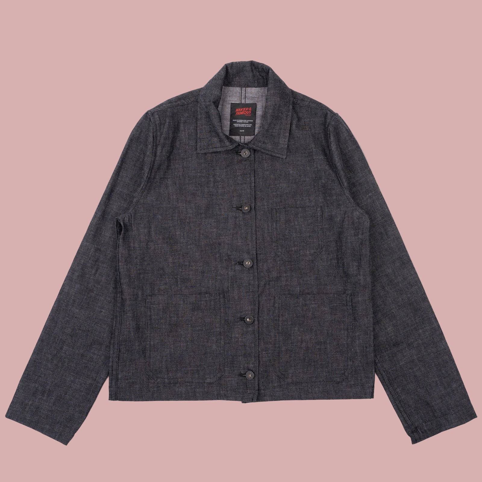 Black Lightweight Denim is woven with a black warp and white weft. This unprocessed 2x1 denim gives the subtle look of a perfectly faded black jean — no sanding, no chemicals, just natural character from the first wear. Gracie is the perfect chore coat for women who value both style and practicality.