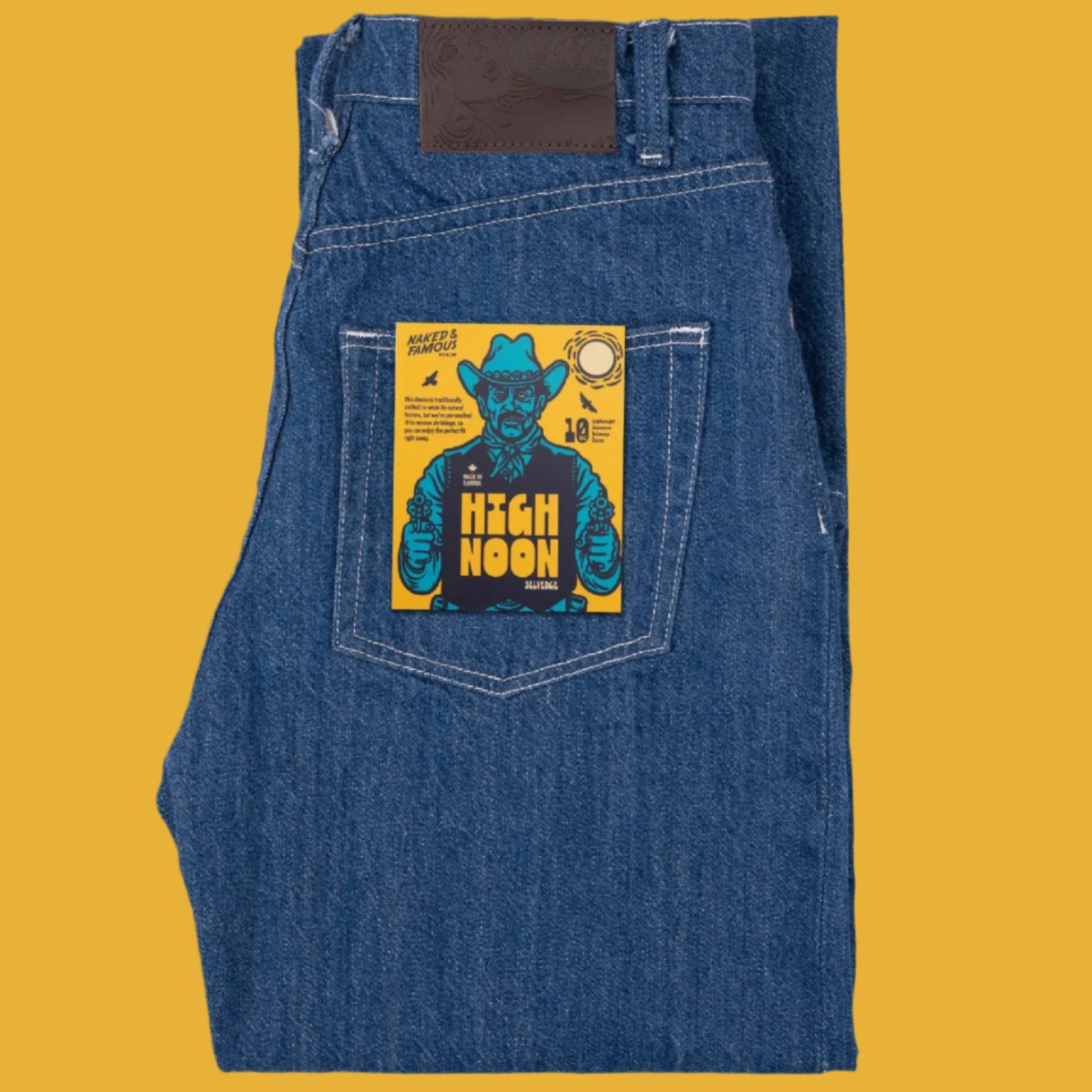 The High Noon Selvedge is a 10oz lightweight Japanese Selvedge Denim, expertly woven on vintage shuttle looms in Okayama, Japan. Inspired by the rugged durability of 1900s era jeans, it captures the essence of that period. Just like denim from that era, the High Noon Selvedge is unsanforized to preserve authenticity. However, each pair has undergone a rinse wash to soften the fabric, minimize shrinkage, and simplify sizing. A defining feature of unsanforized denim is the characteristic leg twist, where the side seams twist along the fabric's bias. This adds a distinctive character to each pair, showcasing the old-world methods prior to the development of anti-skewing techniques designed to eliminate such twists. The denim sports a warm, mid-toned indigo hue, reminiscent of vintage pieces, and is highlighted with a classic red line selvedge ID. This lighter shade of indigo facilitates quicker fading, enabling you to achieve lighter, vintage-style fades much more rapidly. Designed for immediate comfort, the High Noon Selvedge is lightweight and soft, requiring no break-in period. Proudly crafted in our Canadian factory, these jeans feature contrast stitching, zip fly, a dark brown leather patch, and silver metallic hardware.
