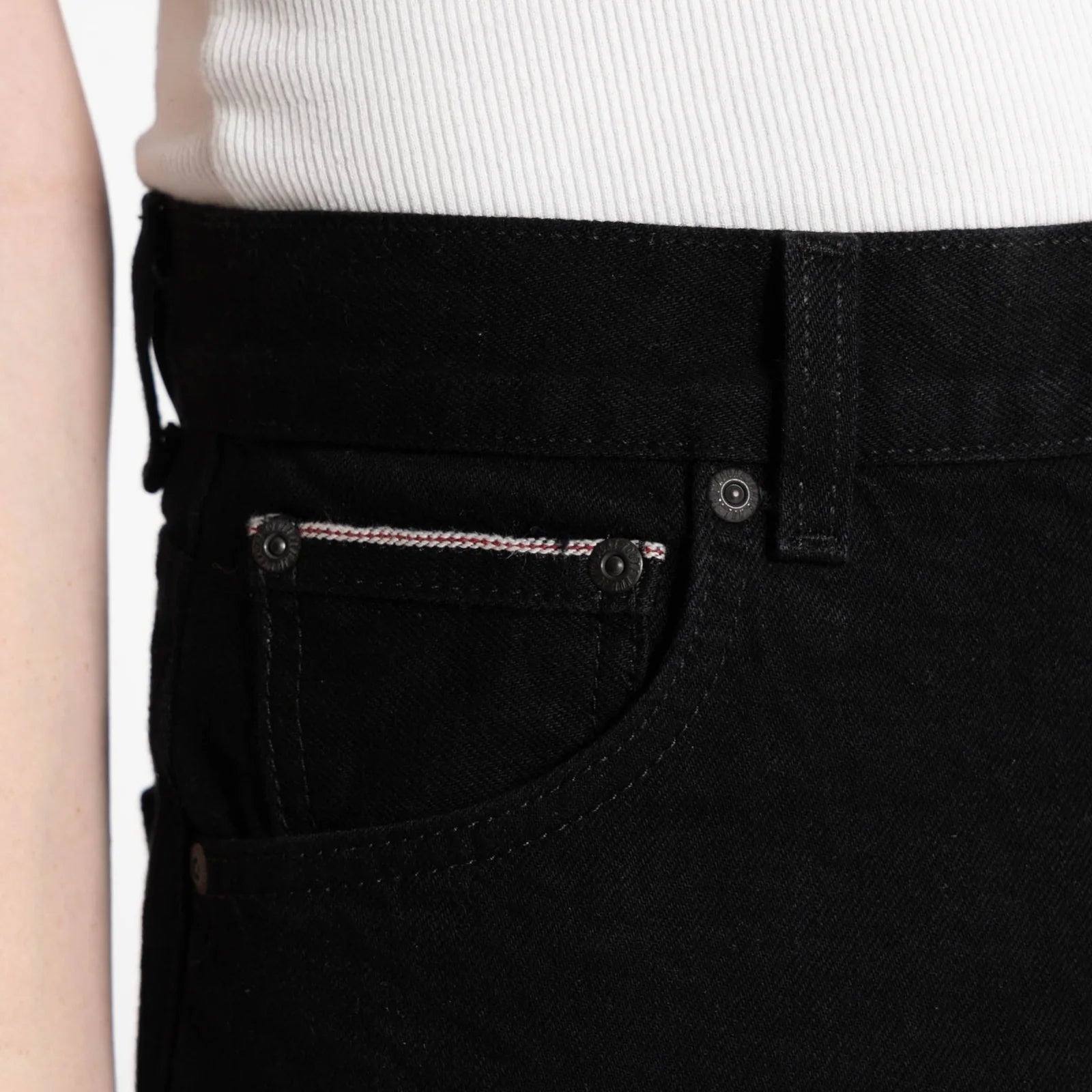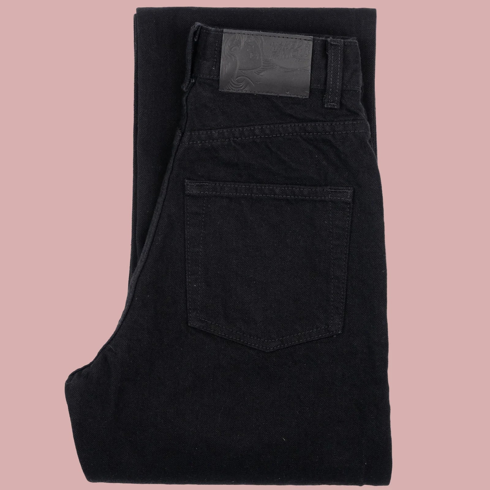 Both the warp and weft are sulfur-dyed black to create a pitch-black denim. The denim is woven on vintage shuttle looms in a right hand twill construction with a classic red line selvedge ID. Cut, sewn, built in Canada with black stitching, a full-grain black leather patch, and black metal buttons and rivets. This denim has been rinsed for extra comfort. True Girl is an everyday denim essential.