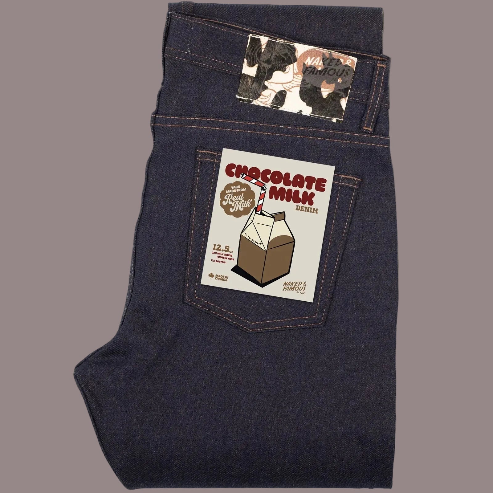 A red-and-white twisted selvedge edge references the striped paper straws commonly seen in vintage chocolate milk advertisements. Cow-print pocket bags and a hair-on-hide leather patch complete the concept, balancing technical novelty with playful detail.