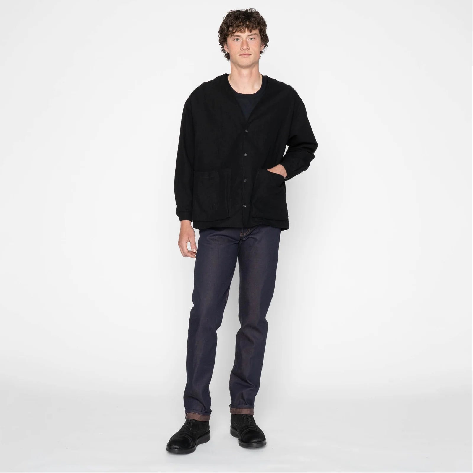 The brown-toned weft is carefully matched to the color of chocolate milk, subtly visible beneath the indigo surface and becoming more pronounced as the denim fades. This interaction creates depth and warmth that evolves naturally with wear.