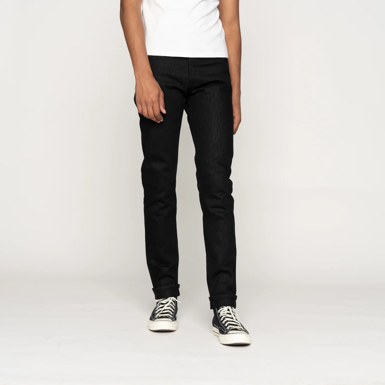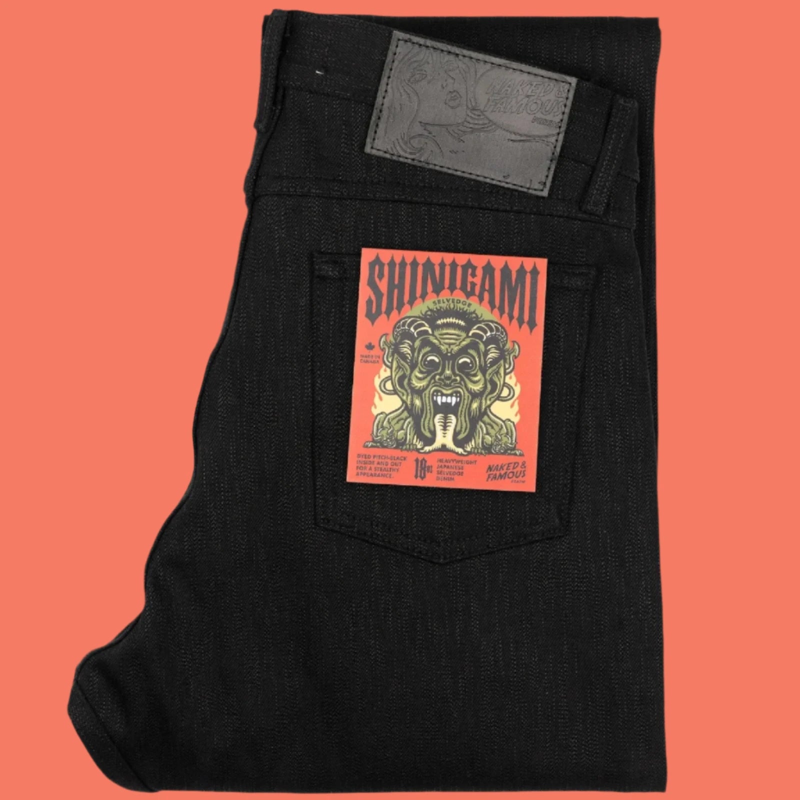 The Shinigami Selvedge is a solid black, 18oz heavyweight Japanese selvedge denim, with an extremely slubby texture. Long-time Naked & Famous Denim fans might find this fabric somewhat familiar; it has been featured in previous collaboration collections and is now making a comeback. The hallmark of this denim is its pronounced slubby texture, a result of blending extra slow, low-tension weaving techniques with heavyweight, irregularly shaped, big slub yarns. These yarns vary in thickness throughout, lending the denim a unique, flame-like appearance with a focus on vertical texture. The low-tension weaving adds to the fabric's irregularity, giving it an almost handwoven quality. The yarns are sulfur dyed, and due to their size irregularities, they fade at different rates, revealing a beautiful spectrum of grey and black tones as the denim ages. The Shinigami Selvedge is sanforized, ensuring minimal shrinkage upon soaking or washing. It is meticulously cut, sewn, and crafted in Canada, featuring tonal stitching, a redline selvedge ID, a thick black leather patch, and tonal blacked-out hardware.