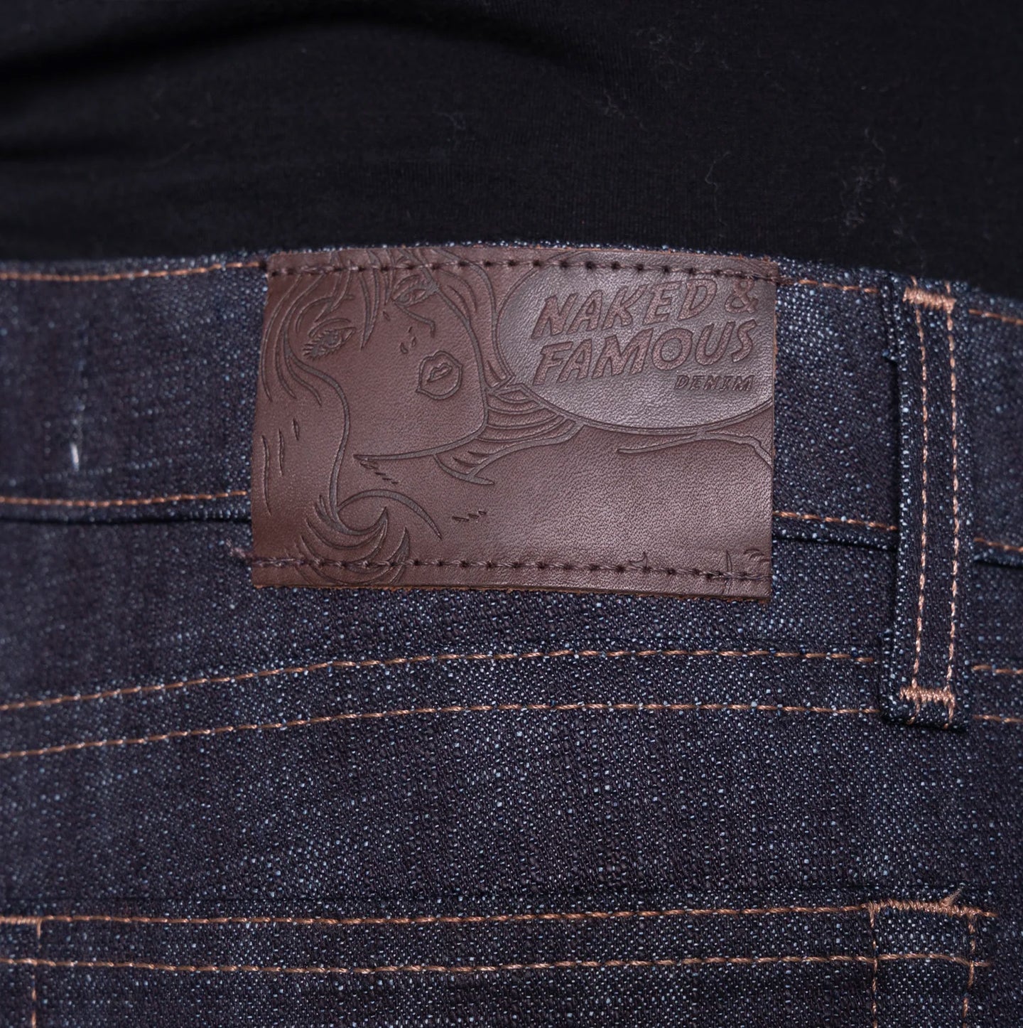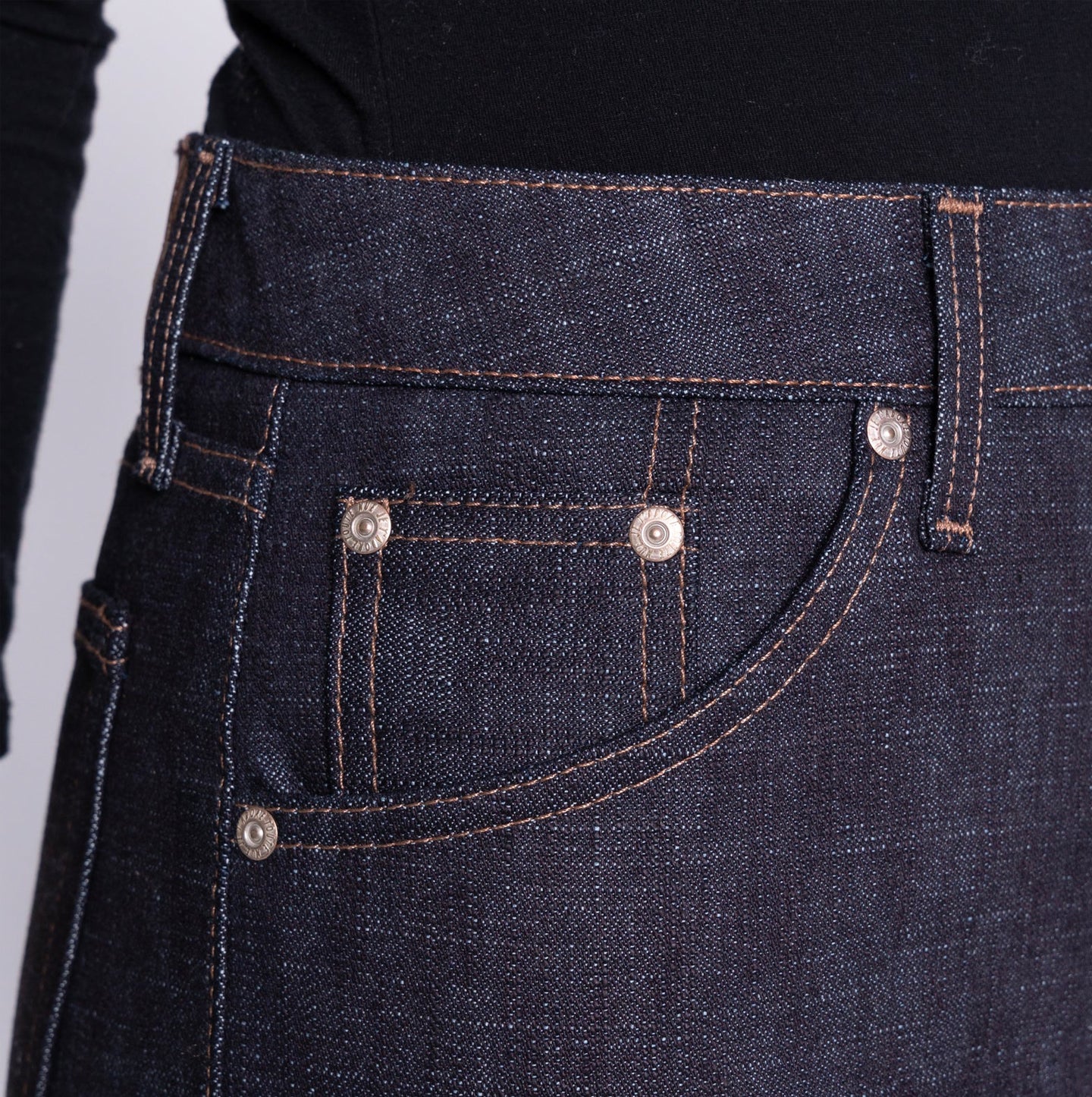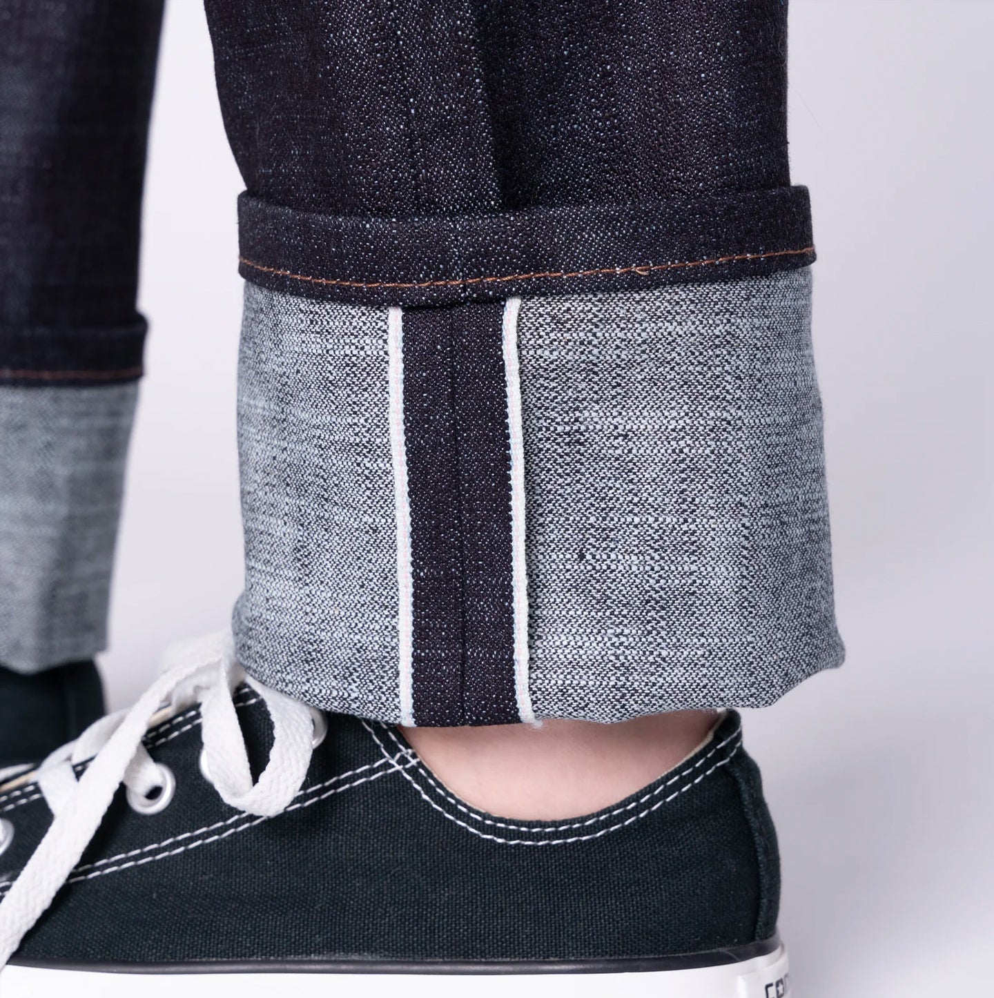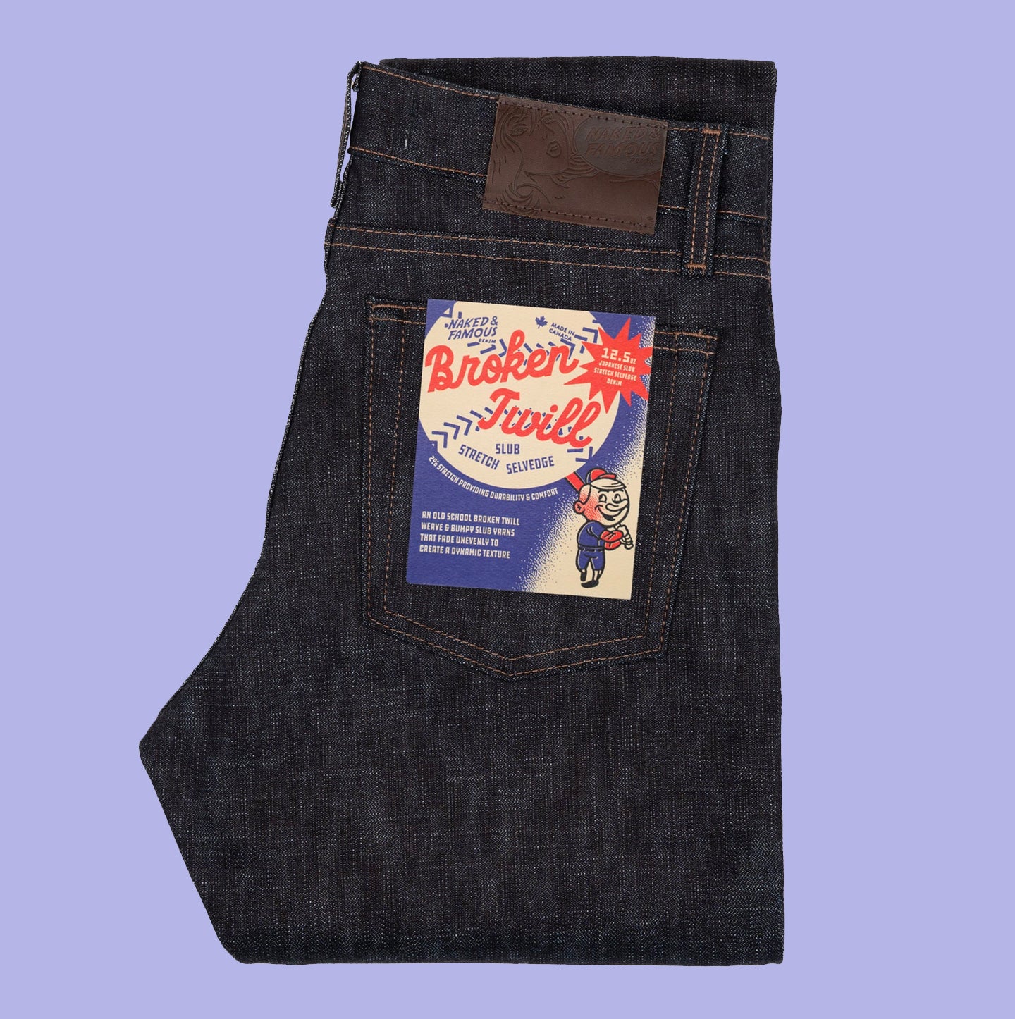 The Broken Twill Slub Stretch Selvedge is a 12.5oz Japanese Stretch Selvedge Denim. This classic white-backed indigo denim comes in a classic yet often overlooked broken twill weave, combining both left hand twill and right hand twill denim in one. The fabric is crafted using irregular, bumpy slub yarns that absorb dye unevenly, with the thicker parts demonstrating deeper indigo penetration compared to the thinner sections. This inconsistency means that the yarns will fade at various rates, accentuating the vertical highlights and offering a dynamic and evolving aesthetic with each wear. With the inclusion of 2% stretch on the weft for added comfort, this denim is designed to stretch horizontally, while high-quality power stretch yarns ensure the denim snaps back to its original form, maintaining its fit and style over time. Despite its crisp feel, this denim is not overly rigid and can be broken in quickly, promising an easy and comfortable wearing experience. Other details include the traditional redline selvedge ID, contrast stitching, a dark brown leather patch, classic button fly, and silver metallic hardware. Each pair is meticulously cut, sewn, and crafted with attention to detail in Canada.