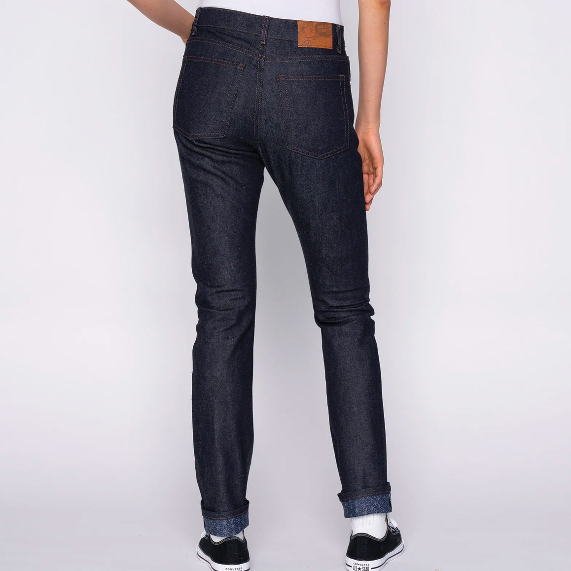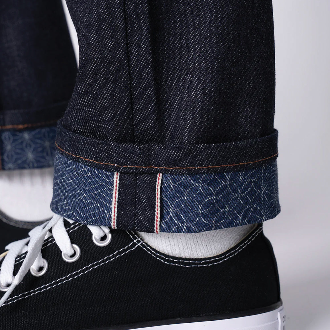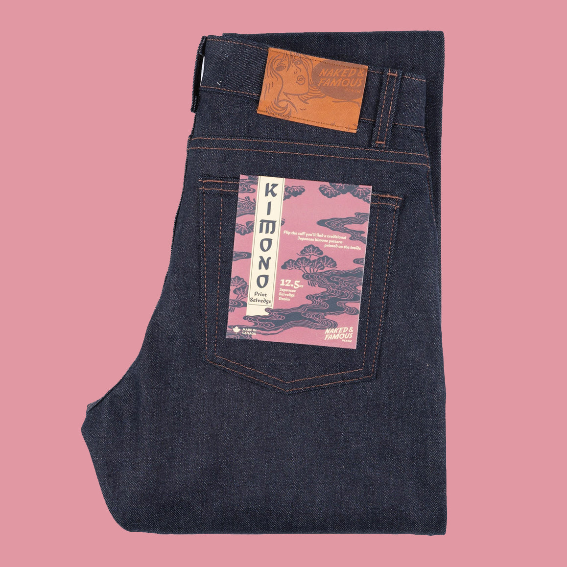 The Kimono Print Selvedge is a 12.5oz Japanese Selvedge Denim woven on vintage shuttle looms in Okayama, Japan. The exterior warp is indigo rope dyed, giving the denim a deep color that will fade beautifully with wear. On the inside, you'll find a traditional Japanese kimono pattern printed on the weft, adding a touch of cultural flair to the denim. The print is visible when you flip the cuff of your jeans, making it a great way to show off your style. Details include contrast stitching, silver metallic hardware, and a vegan-friendly apple leather patch. The selvedge ID features a classic redline, and the jeans feature a button fly and a hidden selvedge coin pocket.