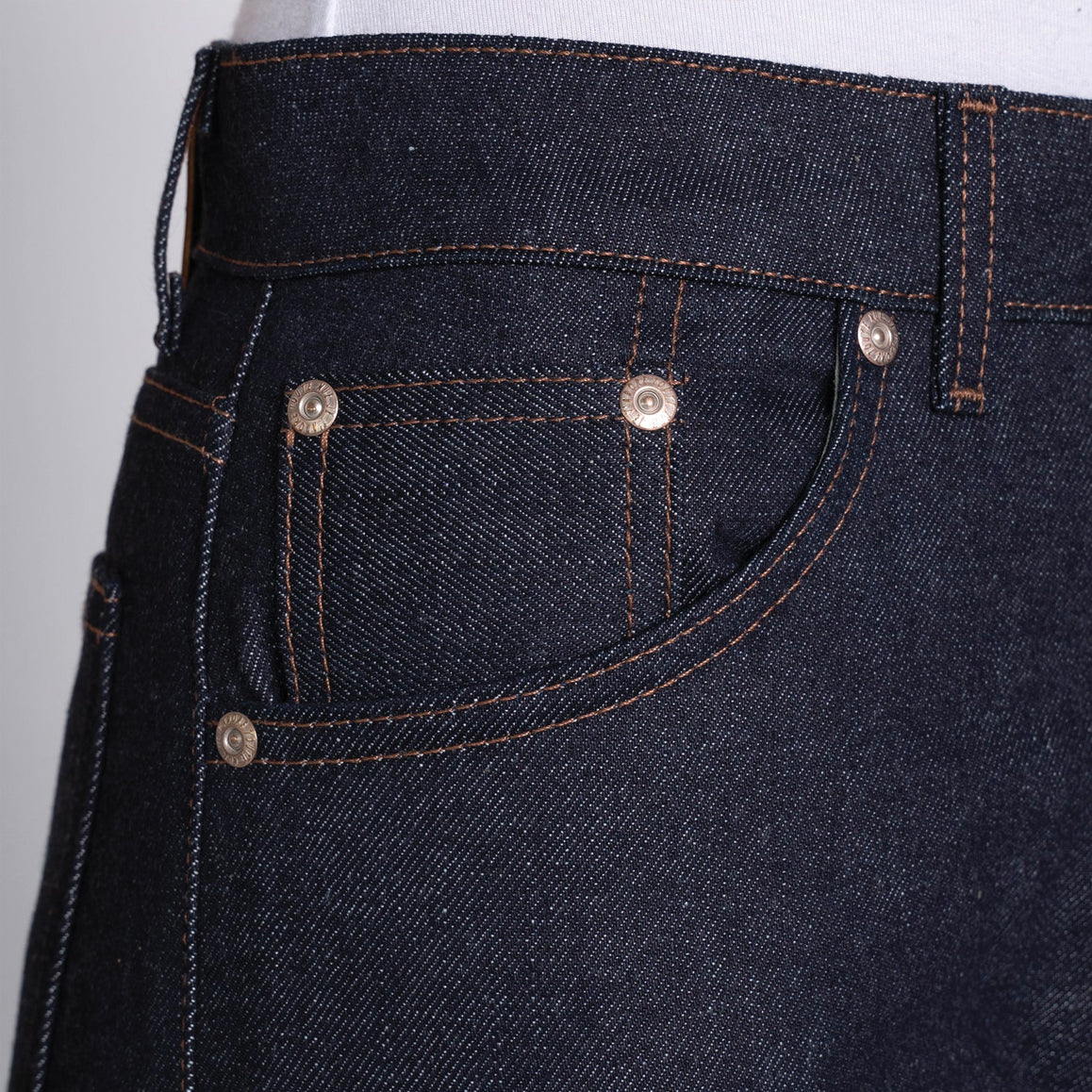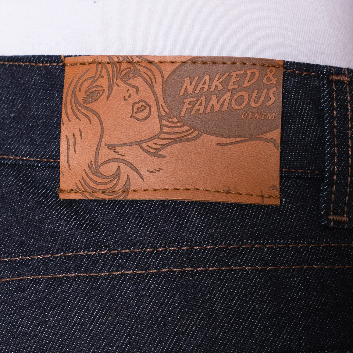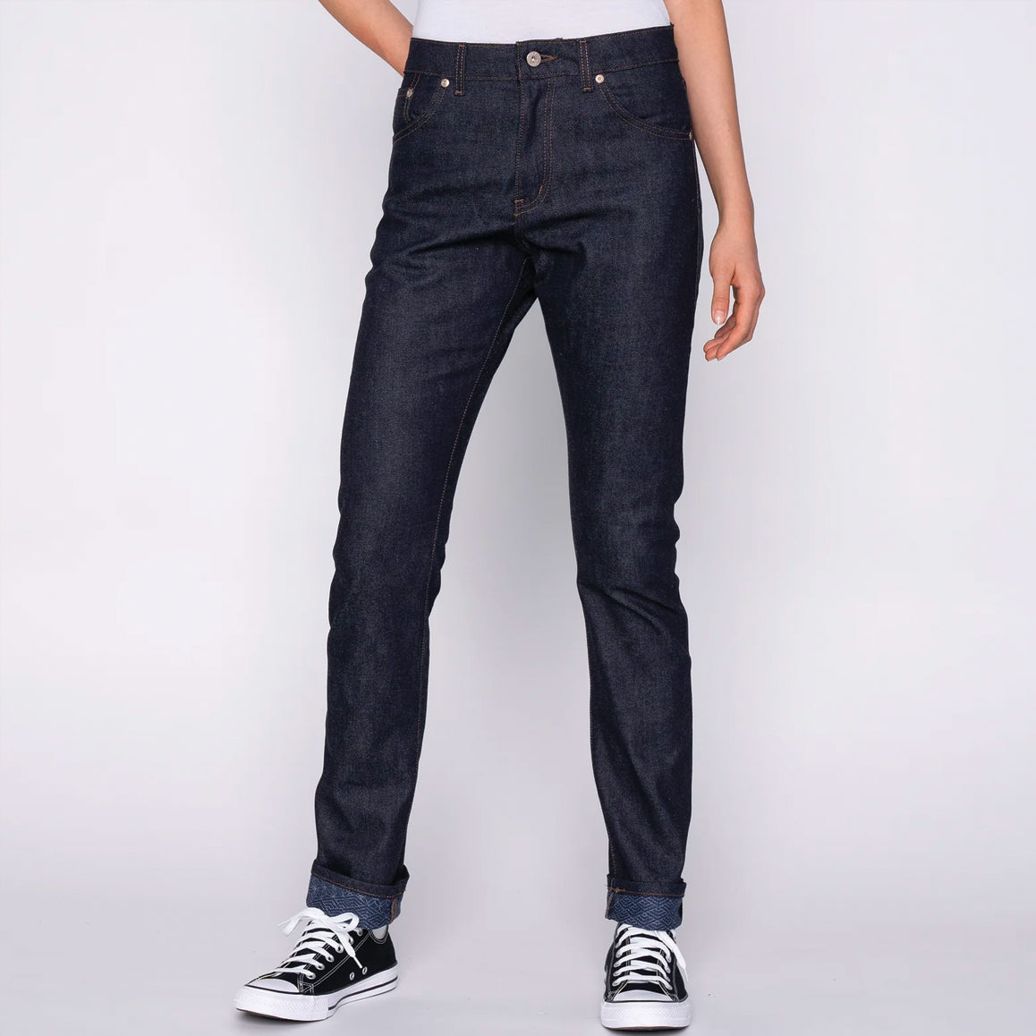 The Kimono Print Selvedge is a 12.5oz Japanese Selvedge Denim woven on vintage shuttle looms in Okayama, Japan. The exterior warp is indigo rope dyed, giving the denim a deep color that will fade beautifully with wear. On the inside, you'll find a traditional Japanese kimono pattern printed on the weft, adding a touch of cultural flair to the denim. The print is visible when you flip the cuff of your jeans, making it a great way to show off your style. Details include contrast stitching, silver metallic hardware, and a vegan-friendly apple leather patch. The selvedge ID features a classic redline, and the jeans feature a button fly and a hidden selvedge coin pocket.
