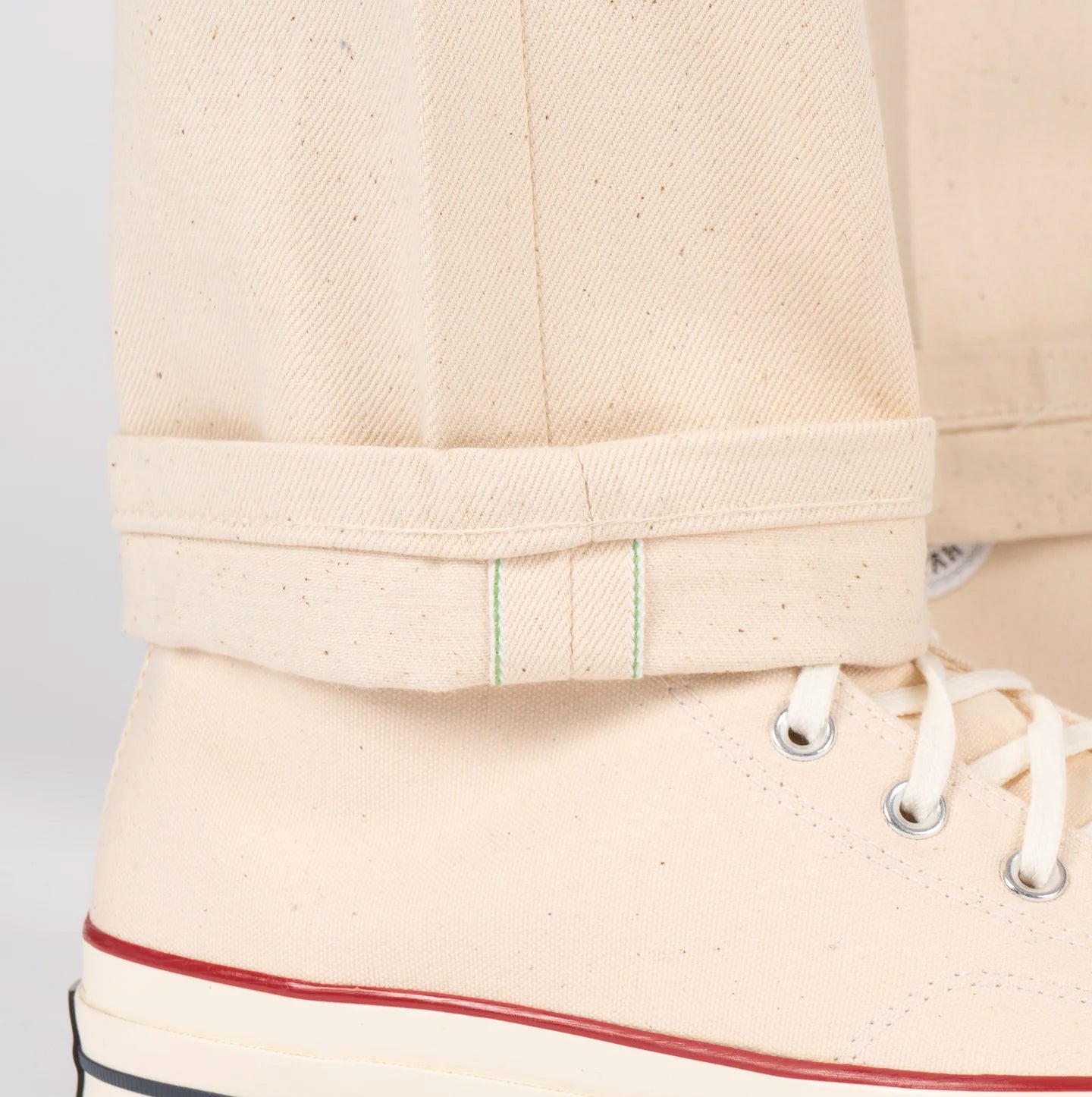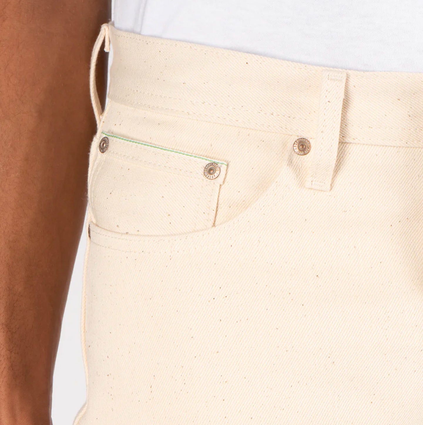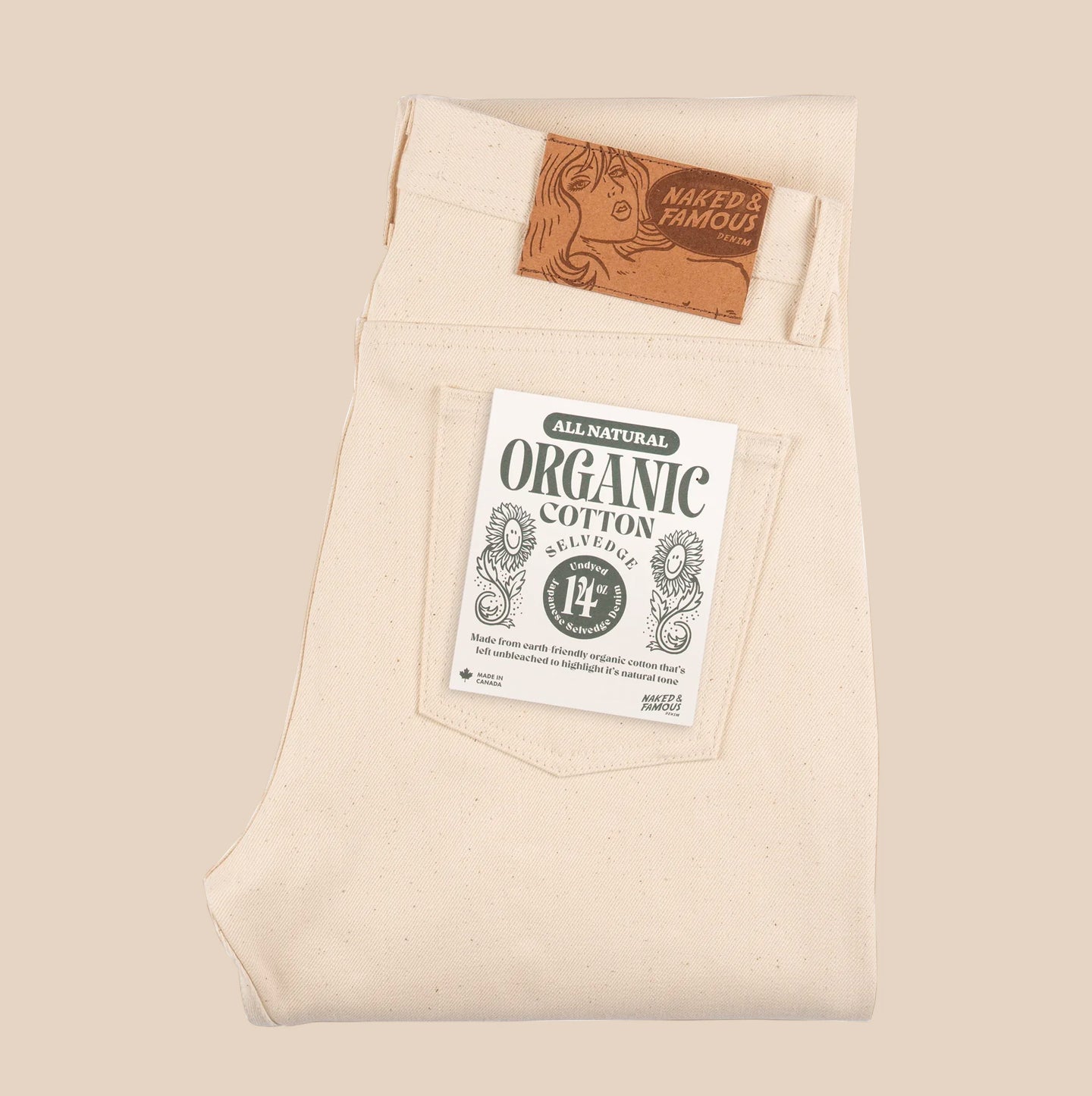 The All Natural Organic Cotton Selvedge is a 14oz undyed Japanese selvedge denim made using organic cotton. The cotton is unbleached highlighting it’s natural color. Small brown fragments of the cottonseed are spotted throughout the fabric. Woven on vintage shuttle looms in Okayama, Japan the denim has a classic raw rigid texture. Cut, sewn, built in Canada with tonal stitching, green line selvedge ID, recycled beige leather patch, and silver metallic buttons and rivets.
