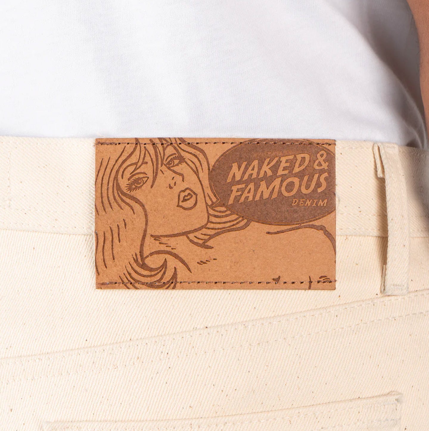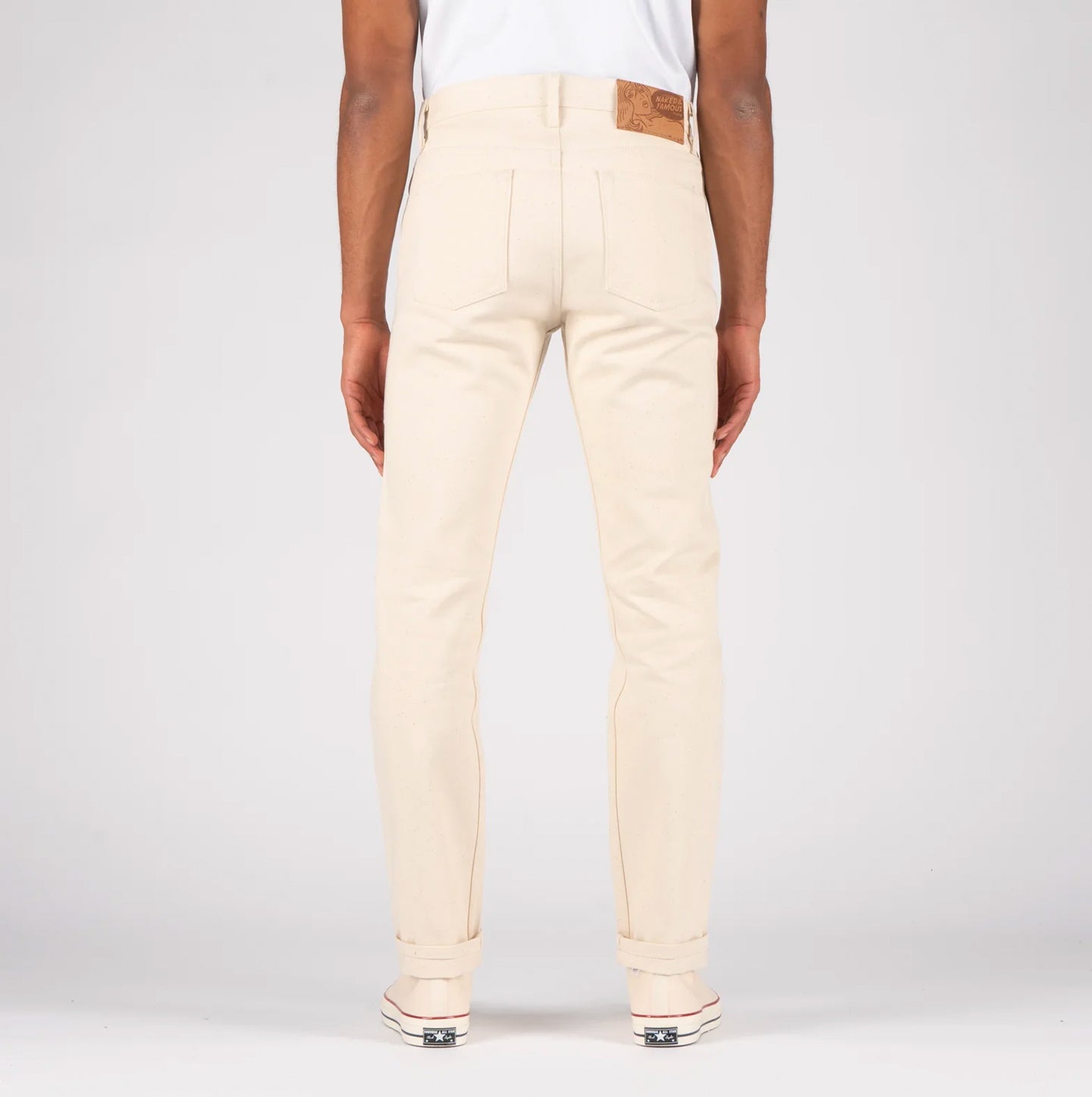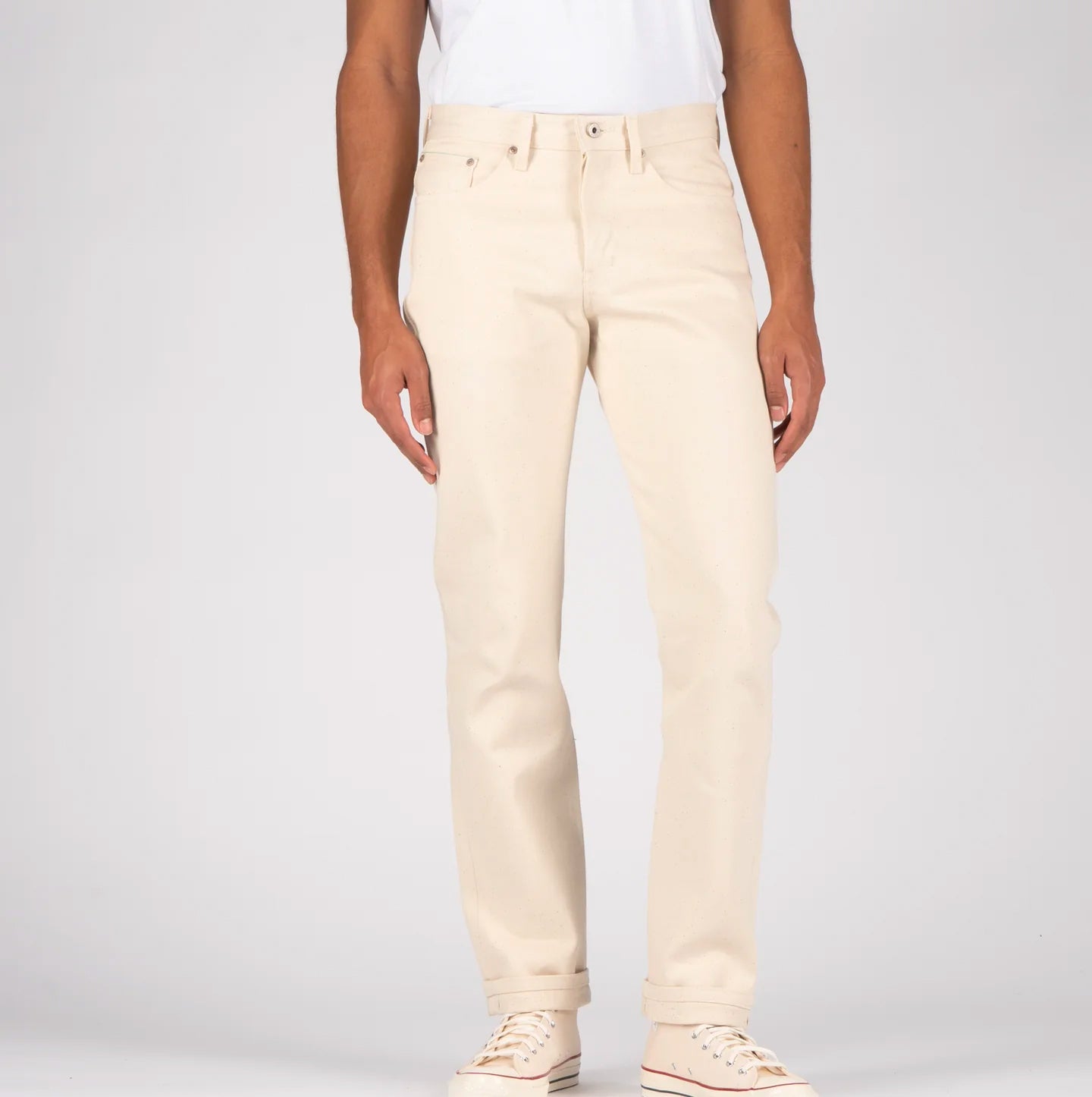 The All Natural Organic Cotton Selvedge is a 14oz undyed Japanese selvedge denim made using organic cotton. The cotton is unbleached highlighting it’s natural color. Small brown fragments of the cottonseed are spotted throughout the fabric. Woven on vintage shuttle looms in Okayama, Japan the denim has a classic raw rigid texture. Cut, sewn, built in Canada with tonal stitching, green line selvedge ID, recycled beige leather patch, and silver metallic buttons and rivets.