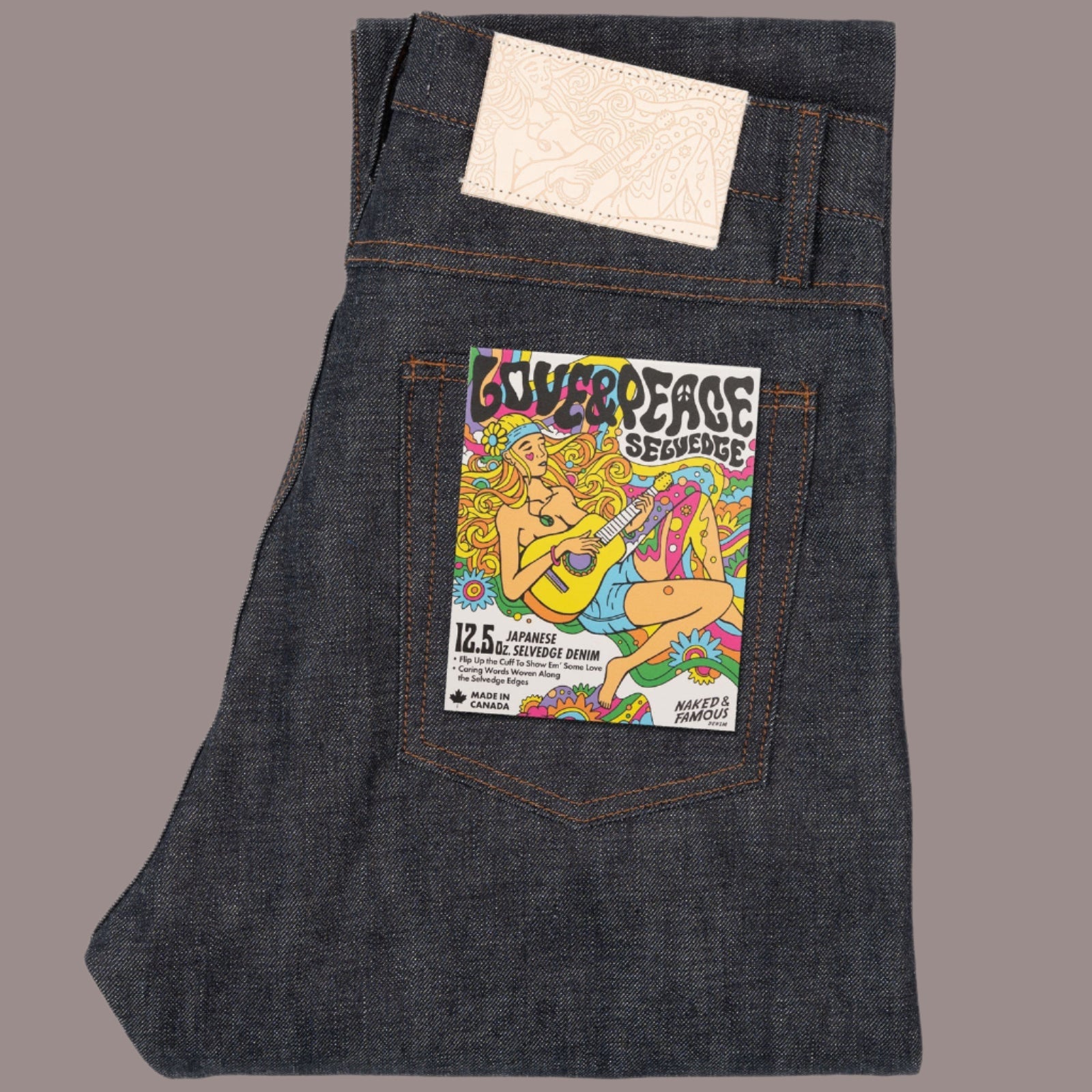 The Love & Peace Selvedge is a 12.5oz Japanese selvedge denim that follows our playful Vulgar Selvedge, known for its bold selvedge ID with naughty words. This iteration champions a positive vibe, featuring 'Love" & "Peace" woven directly into the selvedge ID. It’s our way of saying, "Flip the cuff and spread some love." The fabric presents a crispy and rigid raw denim feel, crafted using short slub yarn. While not overly textured, the short slubs gradually reveal themselves as the denim fades, emphasizing distinct vertical fade patterns. The natural veg-tanned leather patch and pocket flasher are creations of Matt Verdier, a talented artist renowned for his psychedelic retro style artwork. Over time, the leather patch will develop a rich patina, evolving alongside the denim to become even more beautiful with age. Proudly crafted in our Canadian factory, these jeans feature contrast stitching, button fly, and silver metallic hardware.