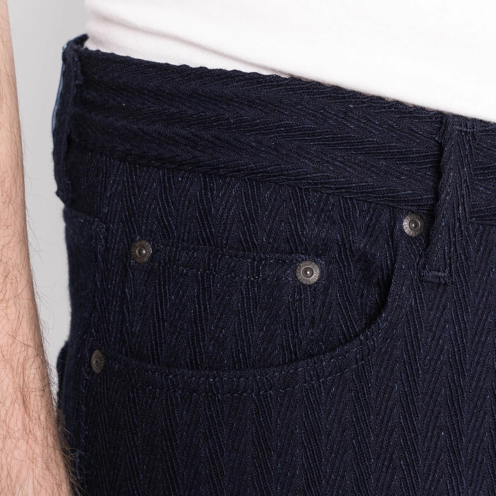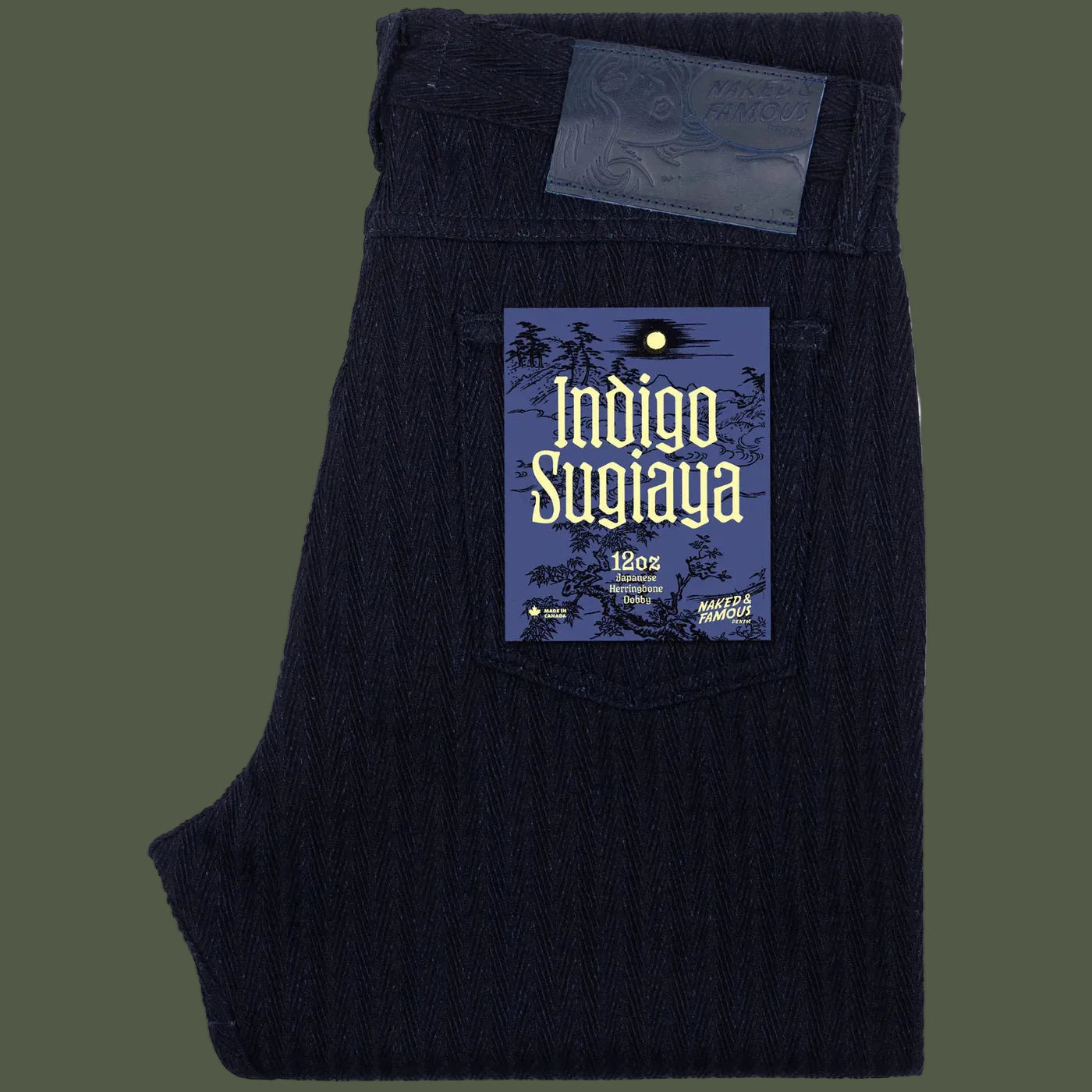 The Indigo Sugiaya is a 12oz Japanese herringbone twill, carefully fabric-rinsed for added comfort and a softened hand. This rinse treatment plumps up the fabric, enhancing the herringbone pattern with a three-dimensional depth that becomes even more pronounced with wear. The result is a beautifully textured, versatile fabric that balances both style and comfort. Other details include tonal stitching, black military-spec buttons and rivets, and a premium Horween Chromexcel Cavalier Ink pull-up leather patch that offers a touch of luxury and durability to this exceptional piece.
