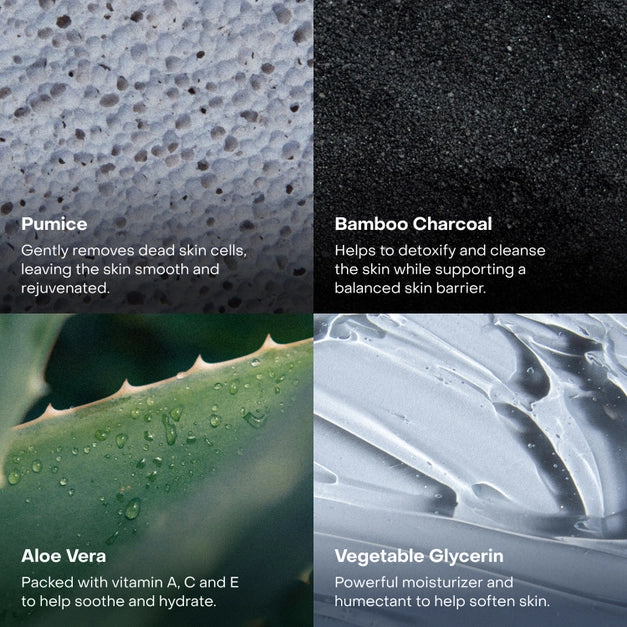 Ingredients: Glycerin, Sodium Lauroyl Glutamate, Organic Aloe Barbadensis (Aloe Vera) Leaf Juice, Sodium Cocoyl Isethionate, Pumice, Polyglyceryl-3 Betainate Acetate, Glyceryl Caprylate/Caprate, Propanediol, Microcrystalline Cellulose, Citrus Aurantium Dulcis (Orange) Peel Oil, Limonene, Mentha Piperita (Peppermint) Oil, Rosmarinus Officinalis (Rosemary) Leaf Oil, Charcoal Powder, Citrus Aurantium Bergamia (Bergamot) Fruit Oil, Salvia Sclarea (Clary Sage) Oil, Cellulose, Xanthan Gum, Lecithin, Sclerotium Gum, Pullulan