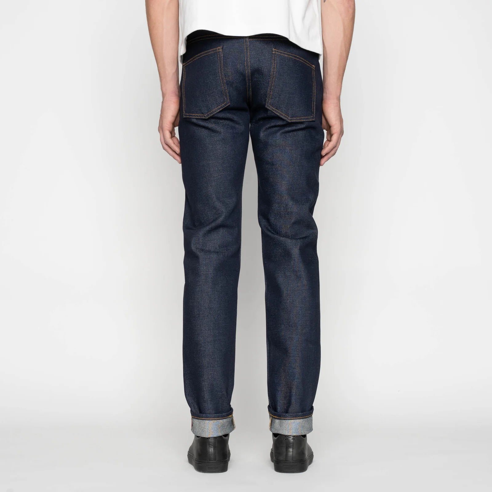 The Super Guy is a skinny fit with a medium rise, a slim top block, and a taper from knee to hem.