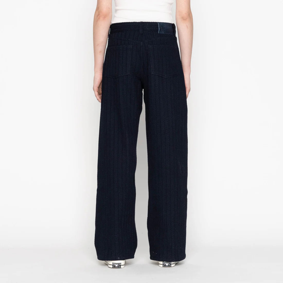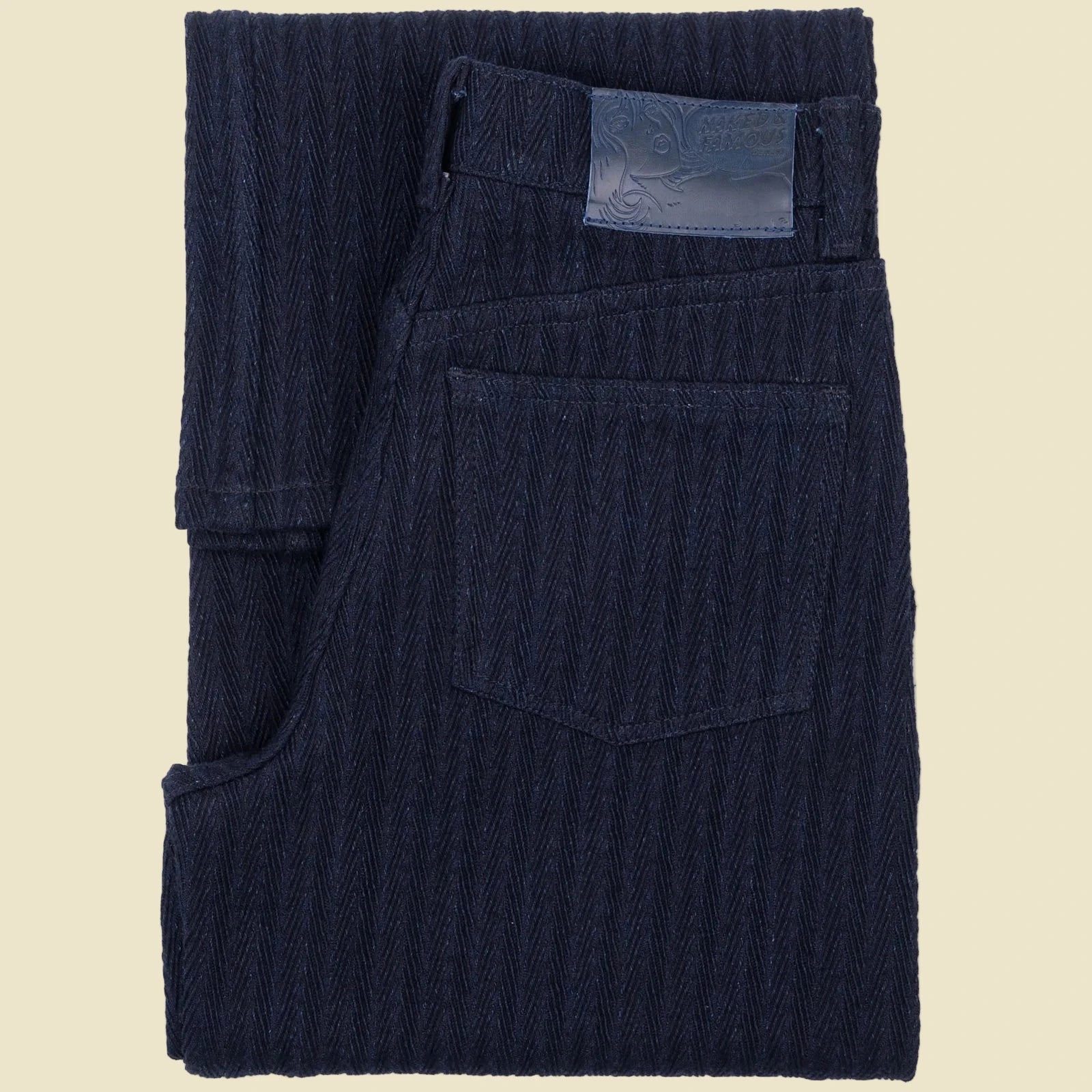 The Indigo Sugiaya is a 12oz Japanese herringbone twill, carefully fabric-rinsed for added comfort and a softened hand. This rinse treatment plumps up the fabric, enhancing the herringbone pattern with a three-dimensional depth that becomes even more pronounced with wear. The result is a beautifully textured, versatile fabric that balances both style and comfort. Other details include tonal stitching, black military-spec buttons and rivets, and a premium Horween Chromexcel Cavalier Ink pull-up leather patch that offers a touch of luxury and durability to this exceptional piece.