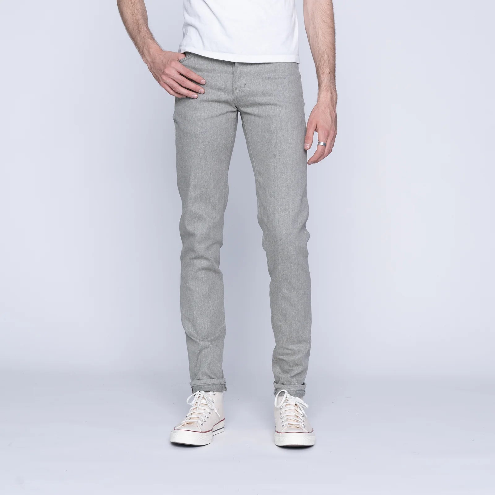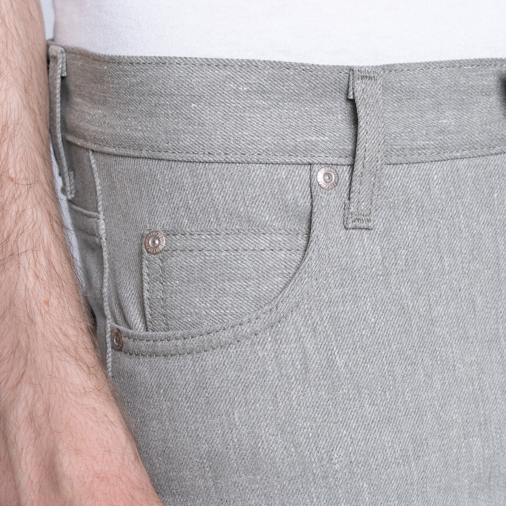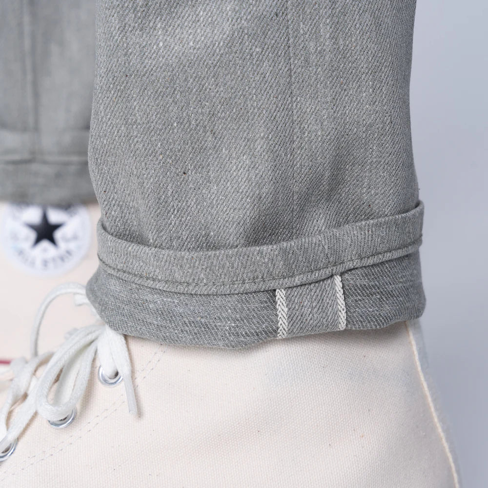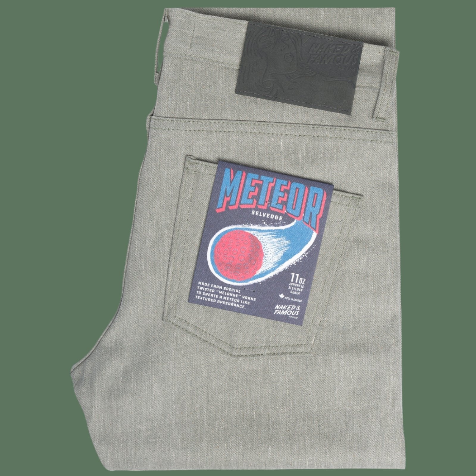 The Meteor Selvedge is a specially crafted 11oz 100% Cotton Japanese selvedge denim, featuring grey mélange yarns in both the exterior warp and interior weft. These mélange yarns, a blend of dyed and undyed fibers, create a fabric with a distinctive and varied heathered appearance, a look unachievable through dyeing alone. It offers the crisp feel characteristic of raw denim, yet its lighter weight facilitates a quick and effortless break-in period. Other details you’ll find include, an all-white selvedge ID, a matte black leather patch, and silver metallic buttons and rivets.