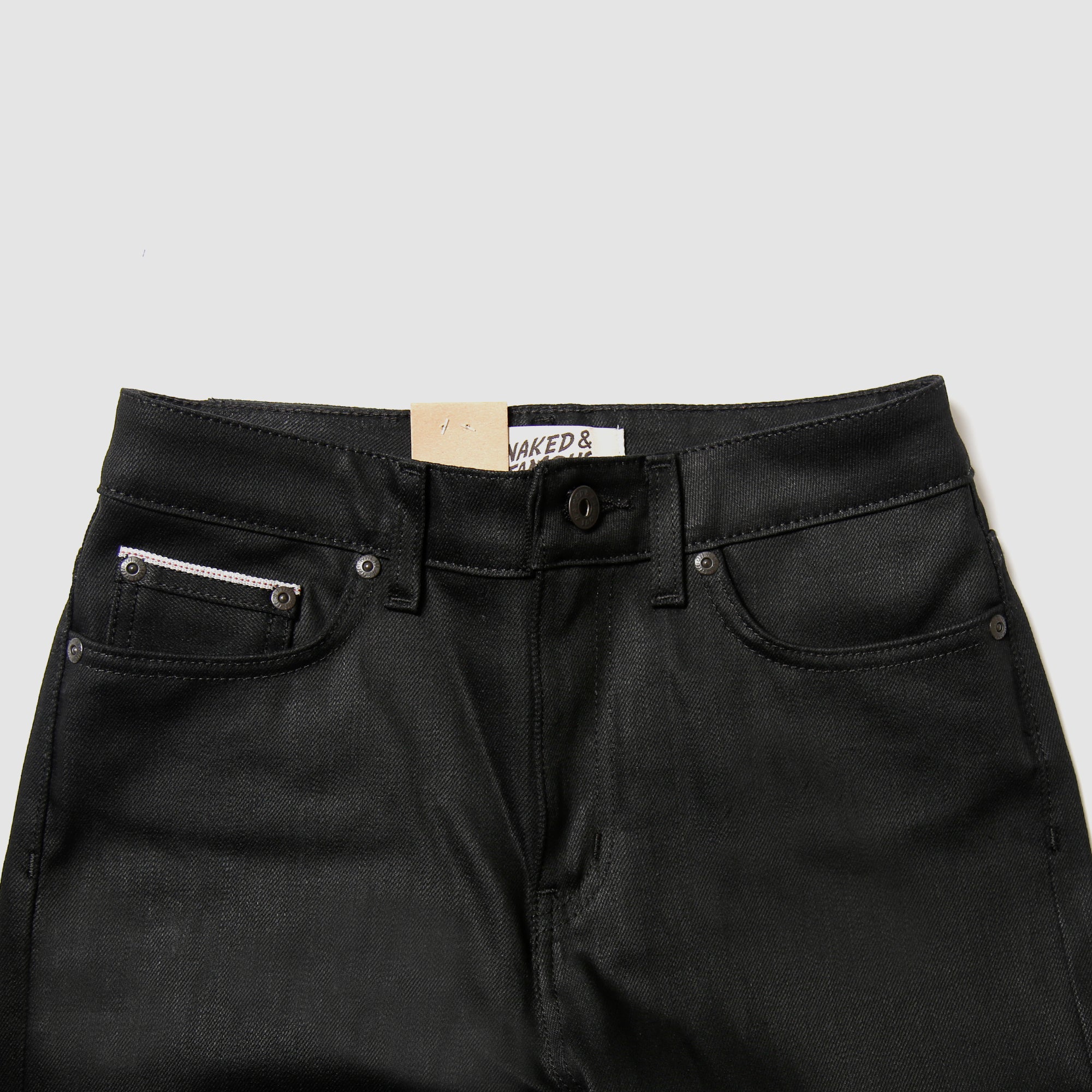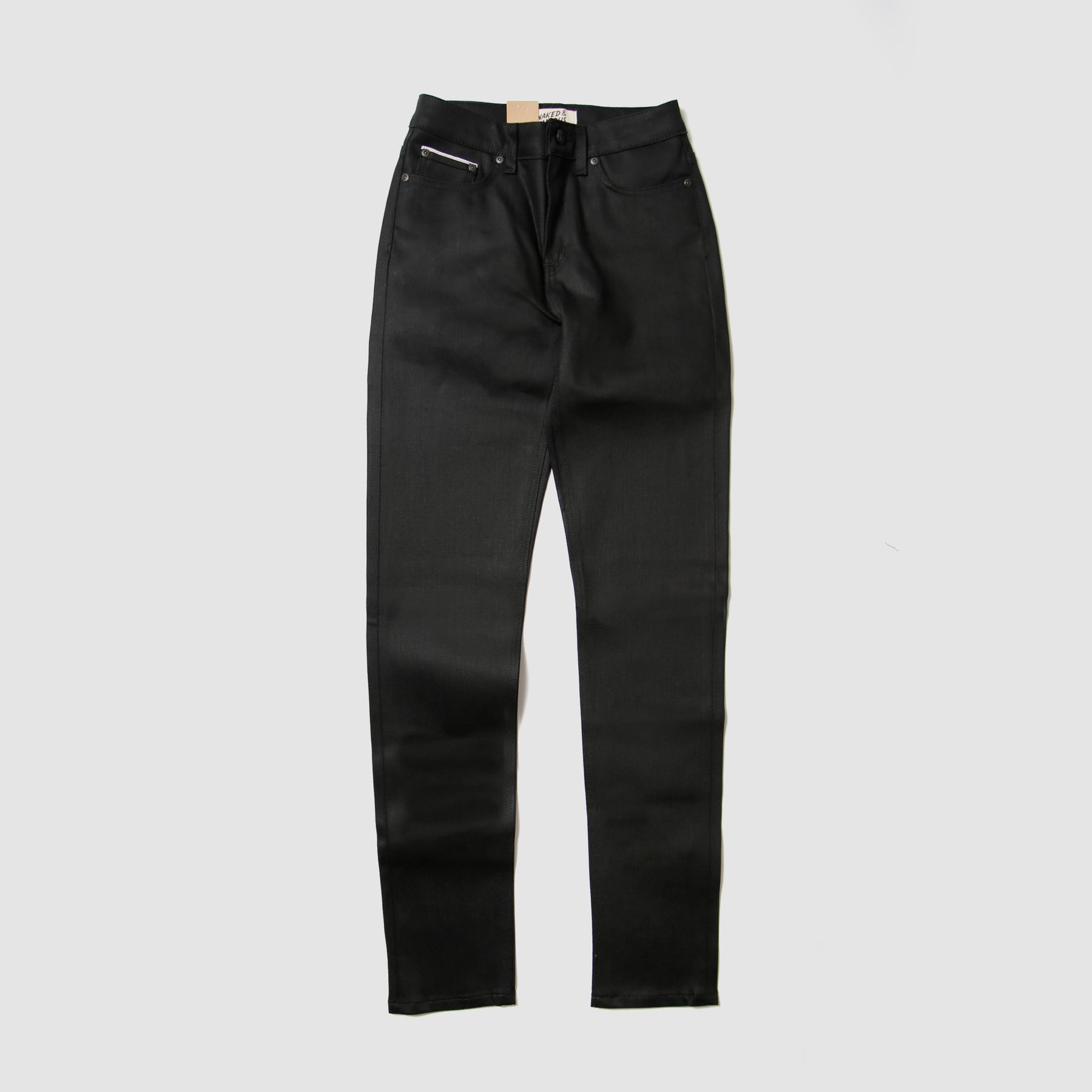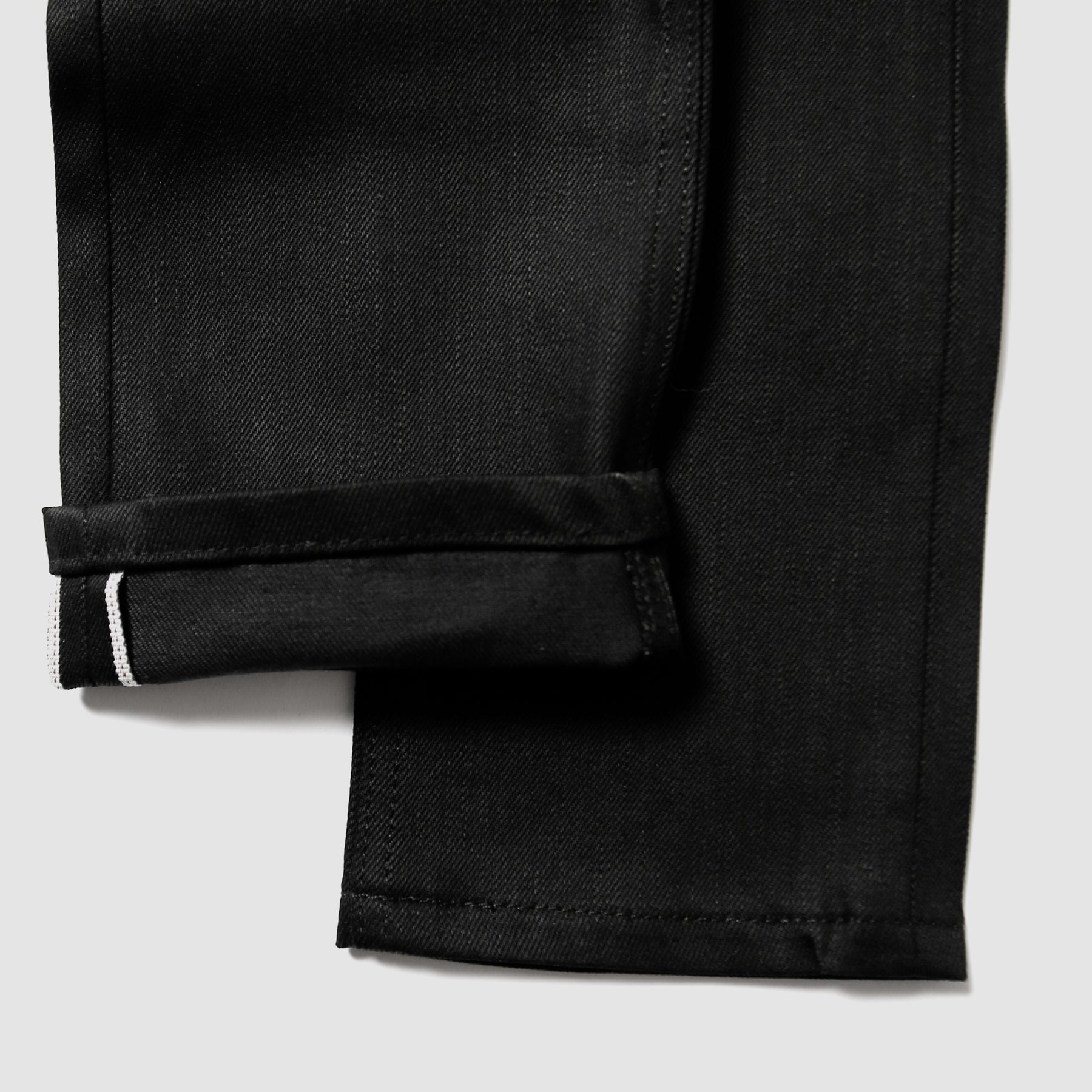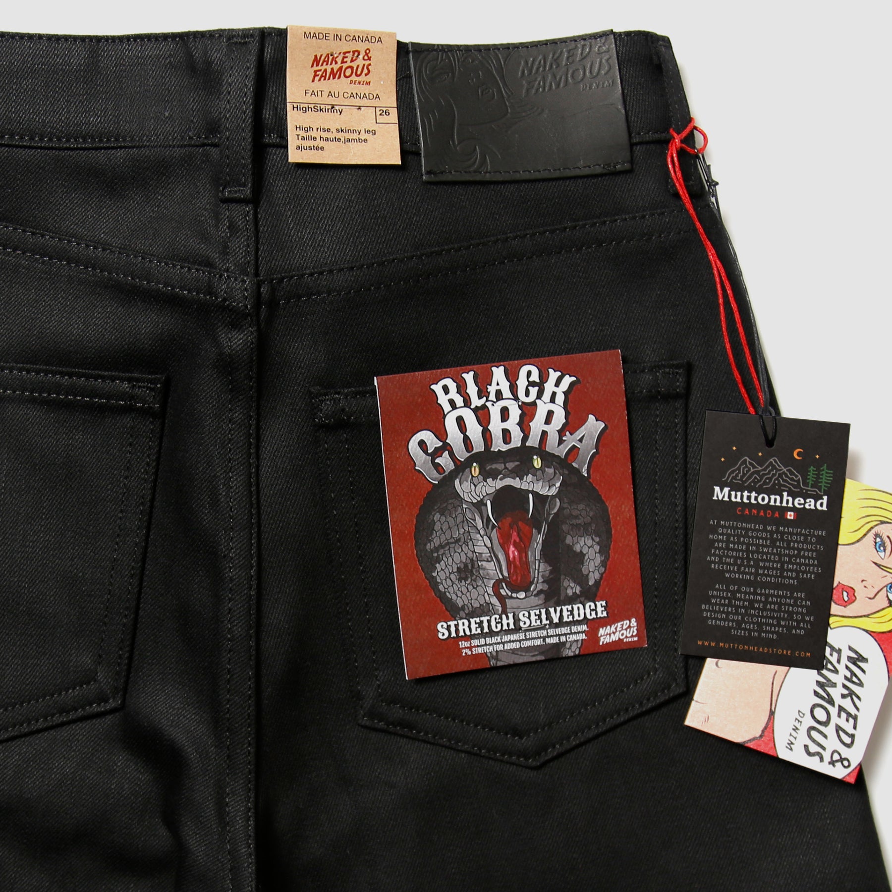The Black Cobra Stretch Selvedge is a 12oz Japanese selvedge denim with a black warp and a black weft to create a pitch-black denim – the only flash of color comes from the red line selvedge ID. The standard weight fabric can be worn year-round, and the touch of stretch offers comfort and flexibility without compromising durability. Cut, sewn, built in Canada with black stitching, a black full grain leather patch, and mil-spec non-reflective black metal buttons and rivets. The High Skinny is a high-rise skinny fit that frames the hips and elongates the legs.