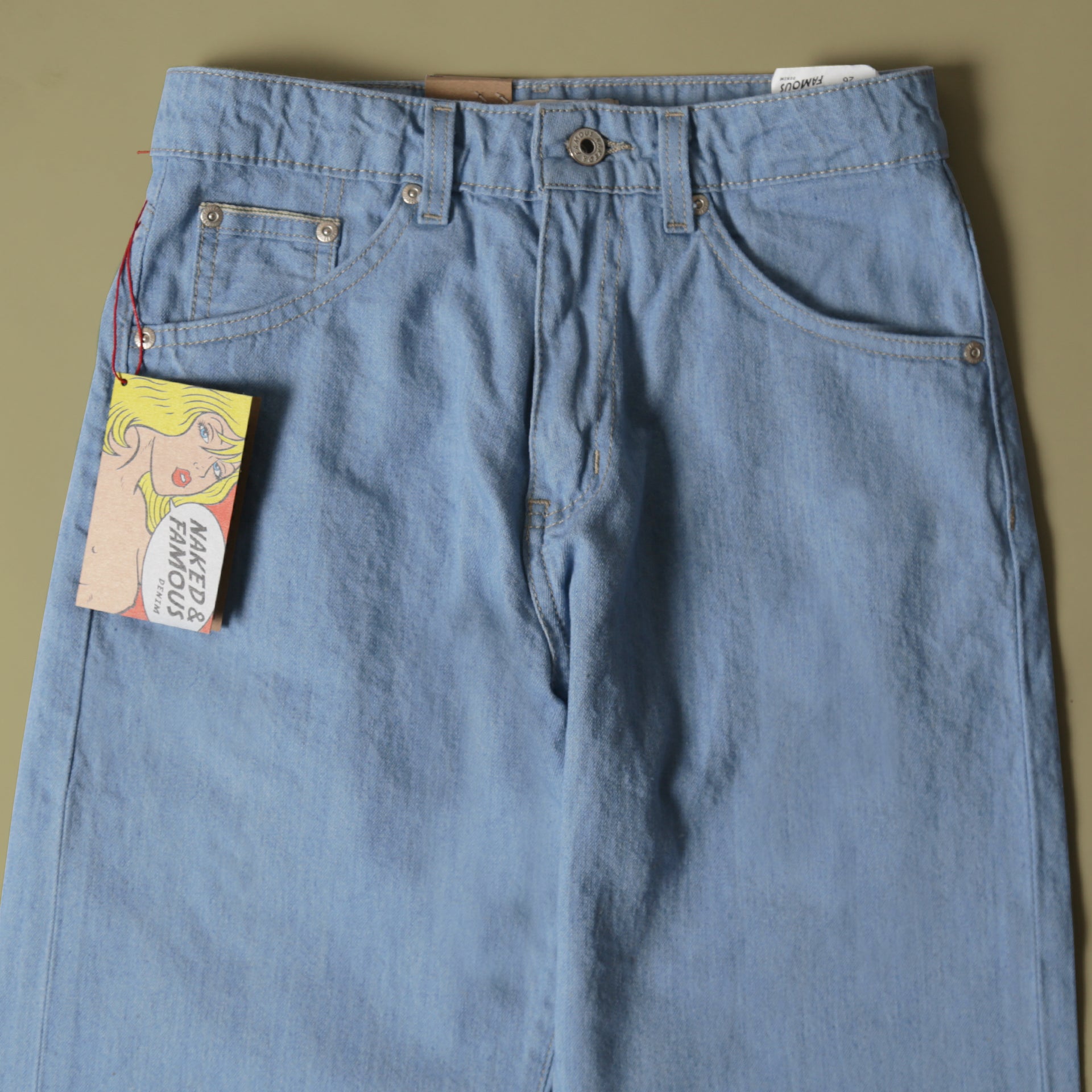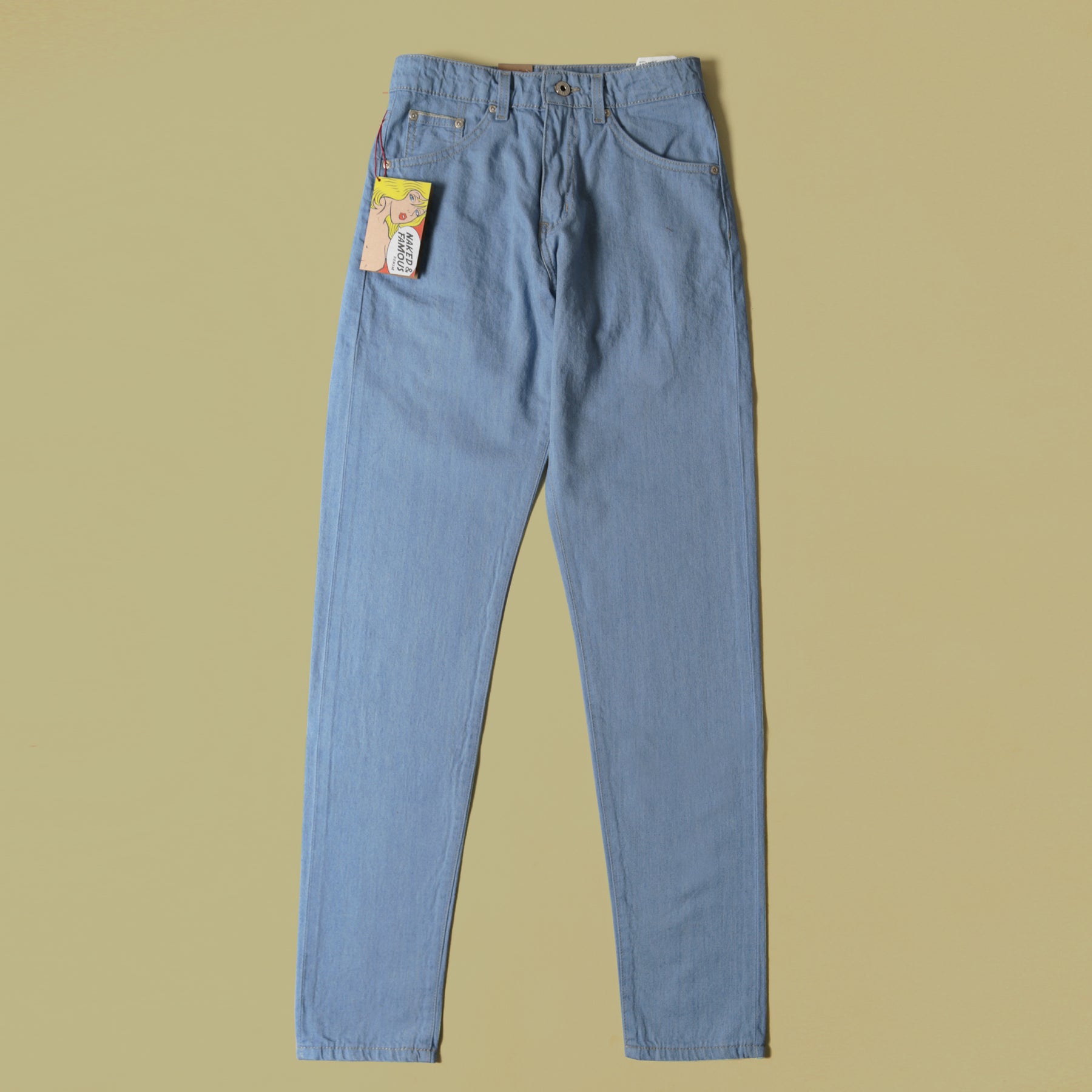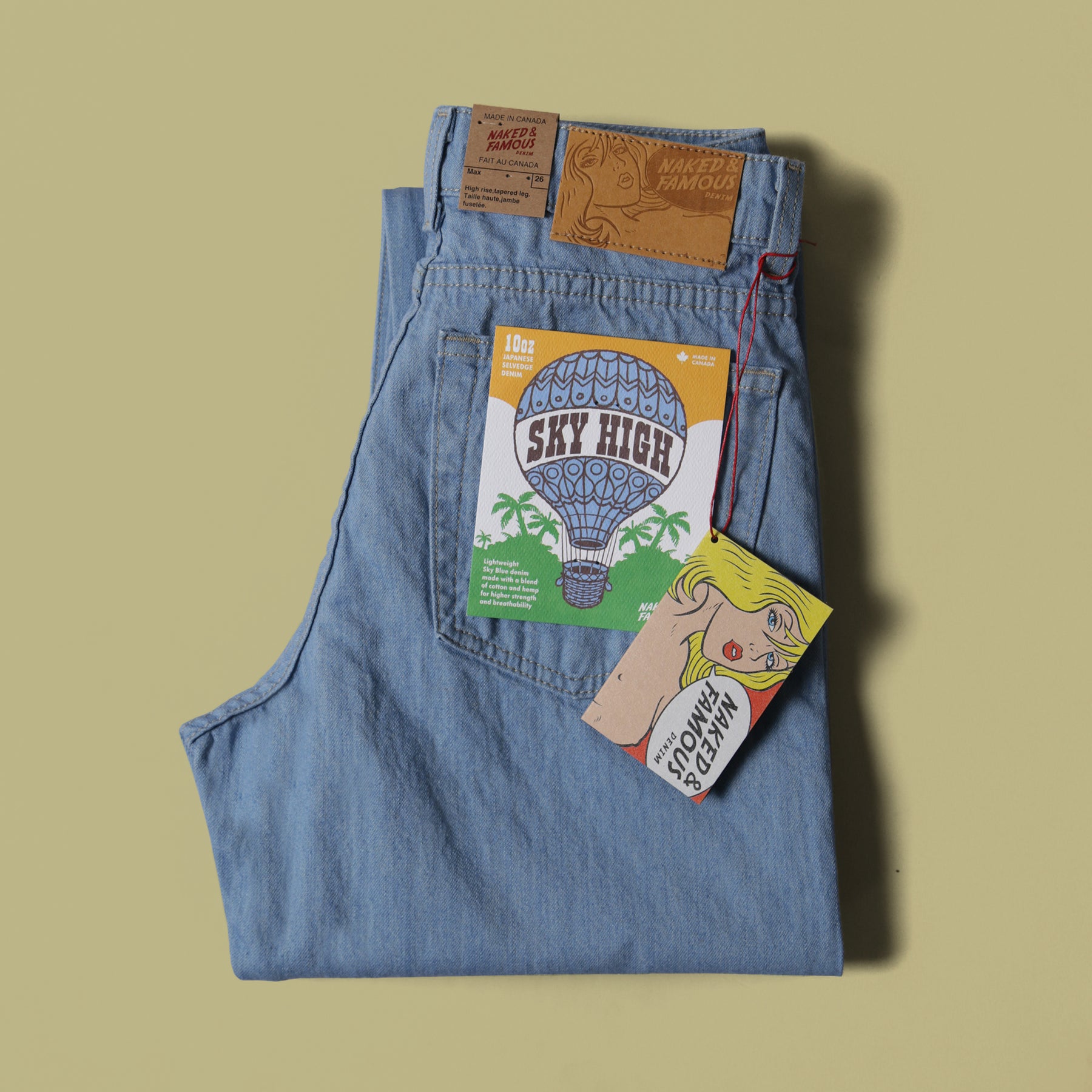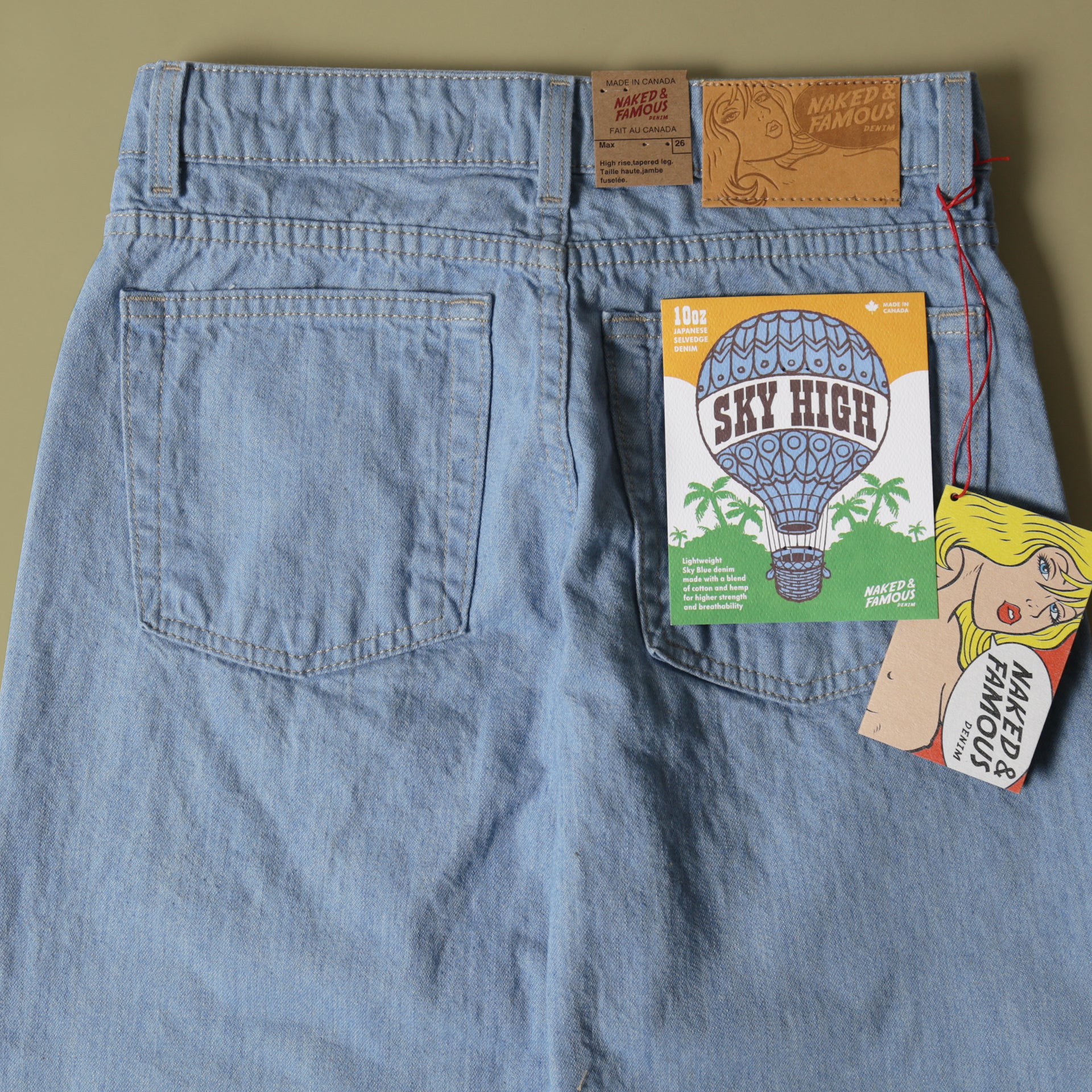 The Sky High Selvedge is a 10oz lightweight Japanese Selvedge denim made with a blend of cotton and 20% real hemp fibers. Hemp fibers are naturally 4x stronger than cotton and provide extra durability for this lightweight denim. The color is a pale light blue inspired by vintage jeans. Cut, sewn, built in Canada with contrast stitching, green line selvedge ID, vintage style paper patch, and silver metallic buttons and rivets.