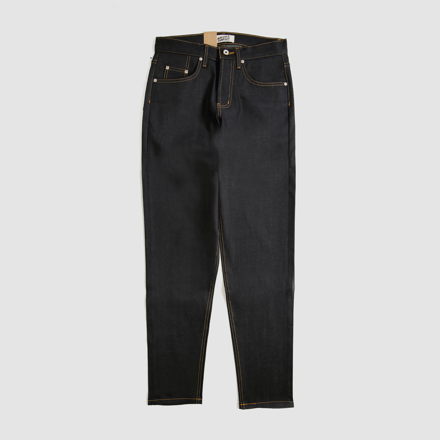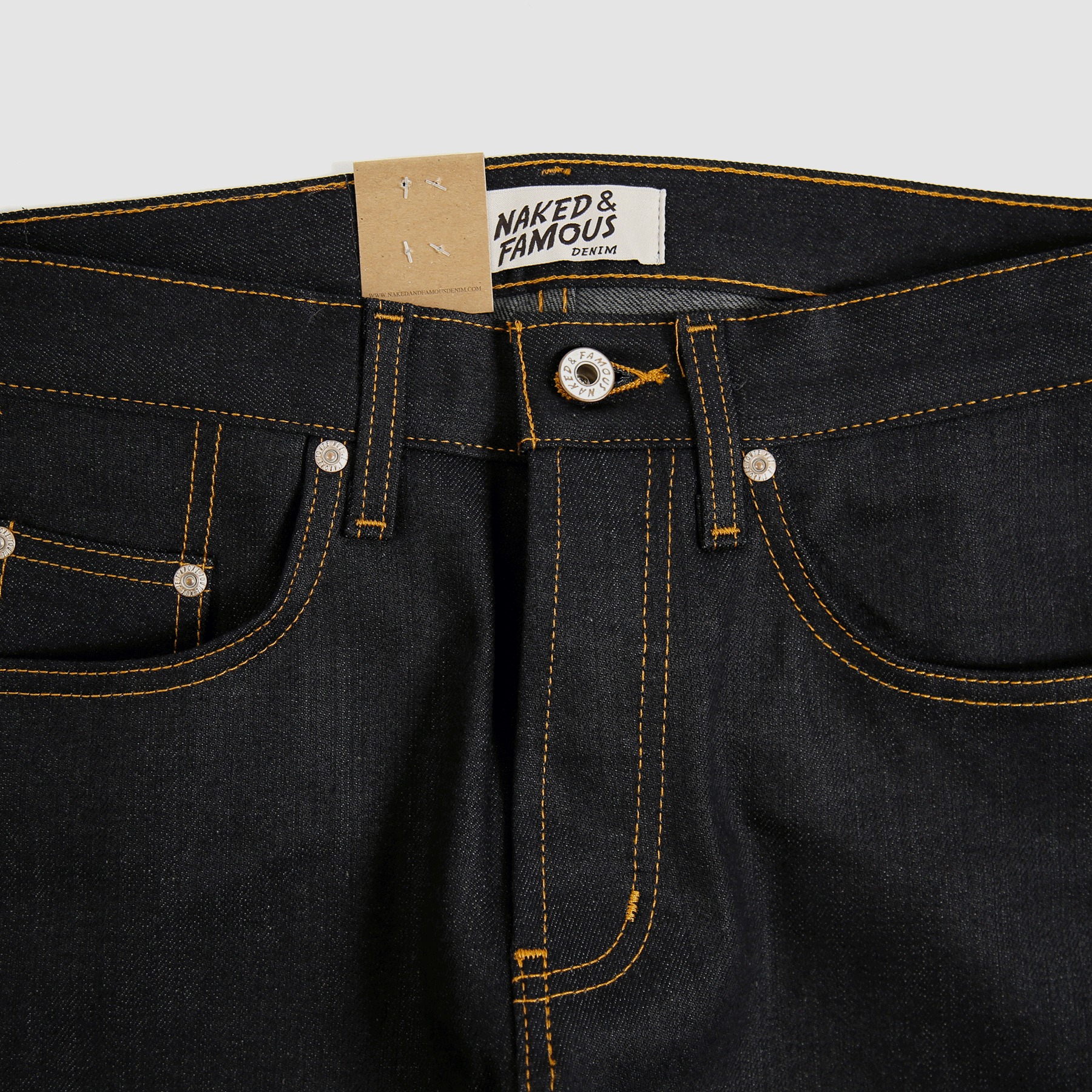 The Deep Indigo Stretch Selvedge is a 12oz indigo rope dyed Japanese selvedge denim, woven on vintage shuttle looms in a right hand twill construction. The deep indigo color is created by combining an indigo dyed warp and grey weft. This denim is made with 2% stretch for added comfort, without compromising durability. Other details include contrast stitching, full grain English tan leather patch, red selvedge ID, silver metallic buttons and rivets. The Easy Guy is a relaxed tapered fit; high rise, fuller in the seat and thigh with a sharp taper from knee to hem.