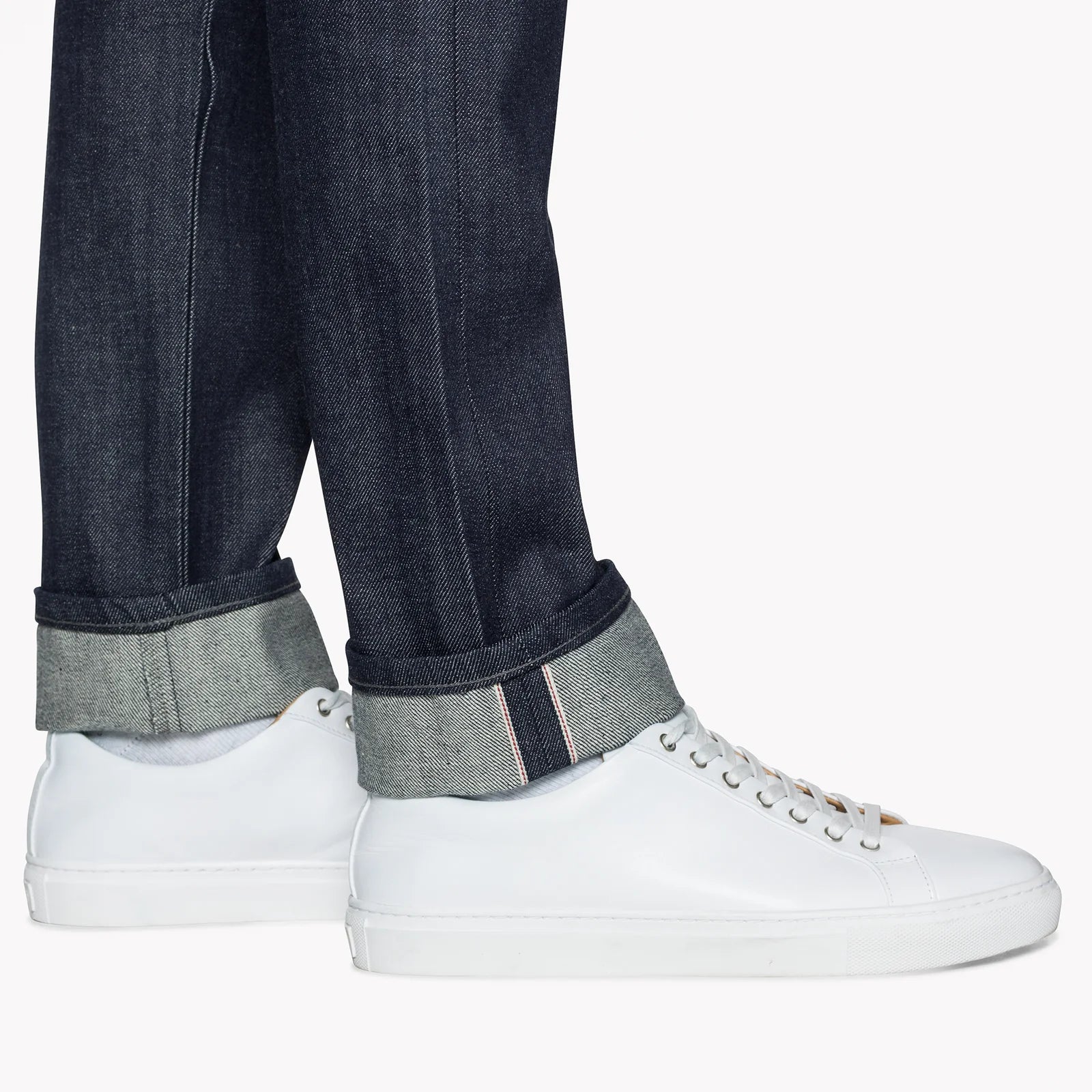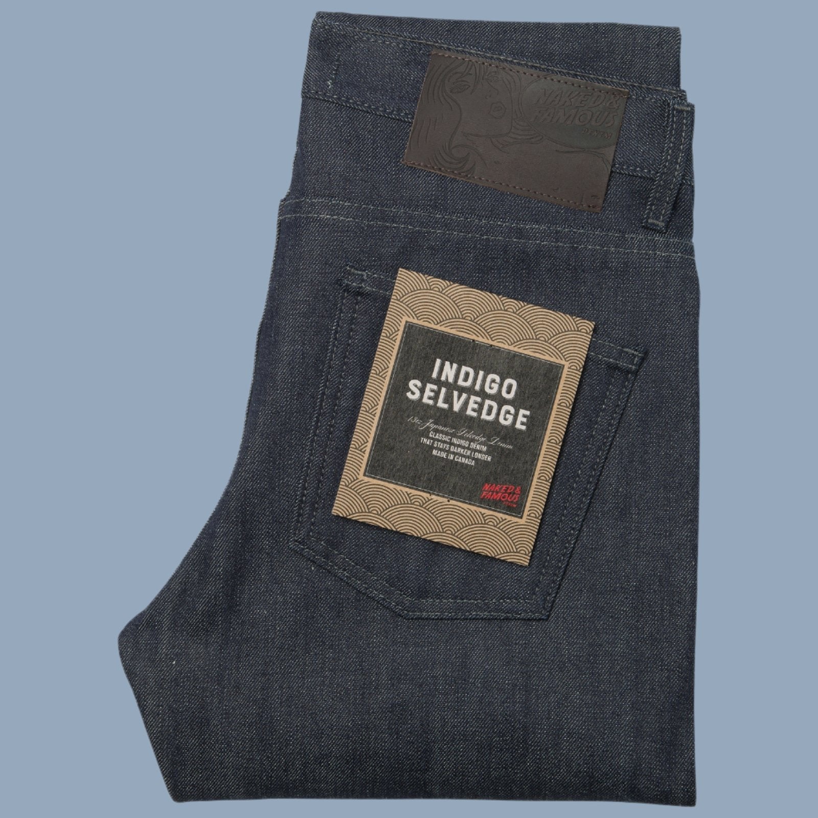 The Indigo Selvedge is a 13oz indigo rope dyed Japanese selvedge denim, woven on vintage shuttle looms in a right hand twill construction. The fabric is dense, and will slowly fade with wear. Other details include contrast stitching, full grain brown leather patch, red selvedge ID, silver metallic buttons and rivets. The Super Guy is a slim tapered fit; medium rise, slim thigh and taper from the knee to hem.
