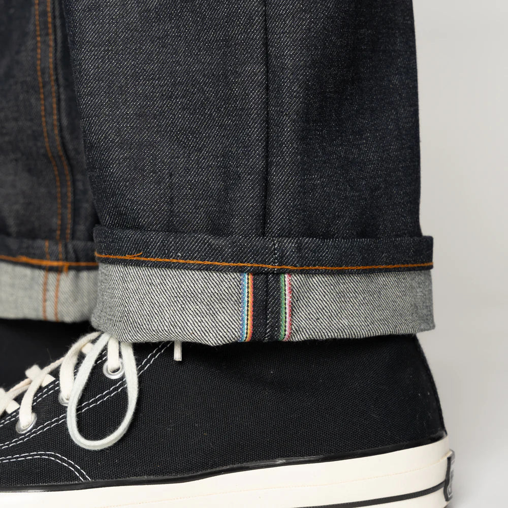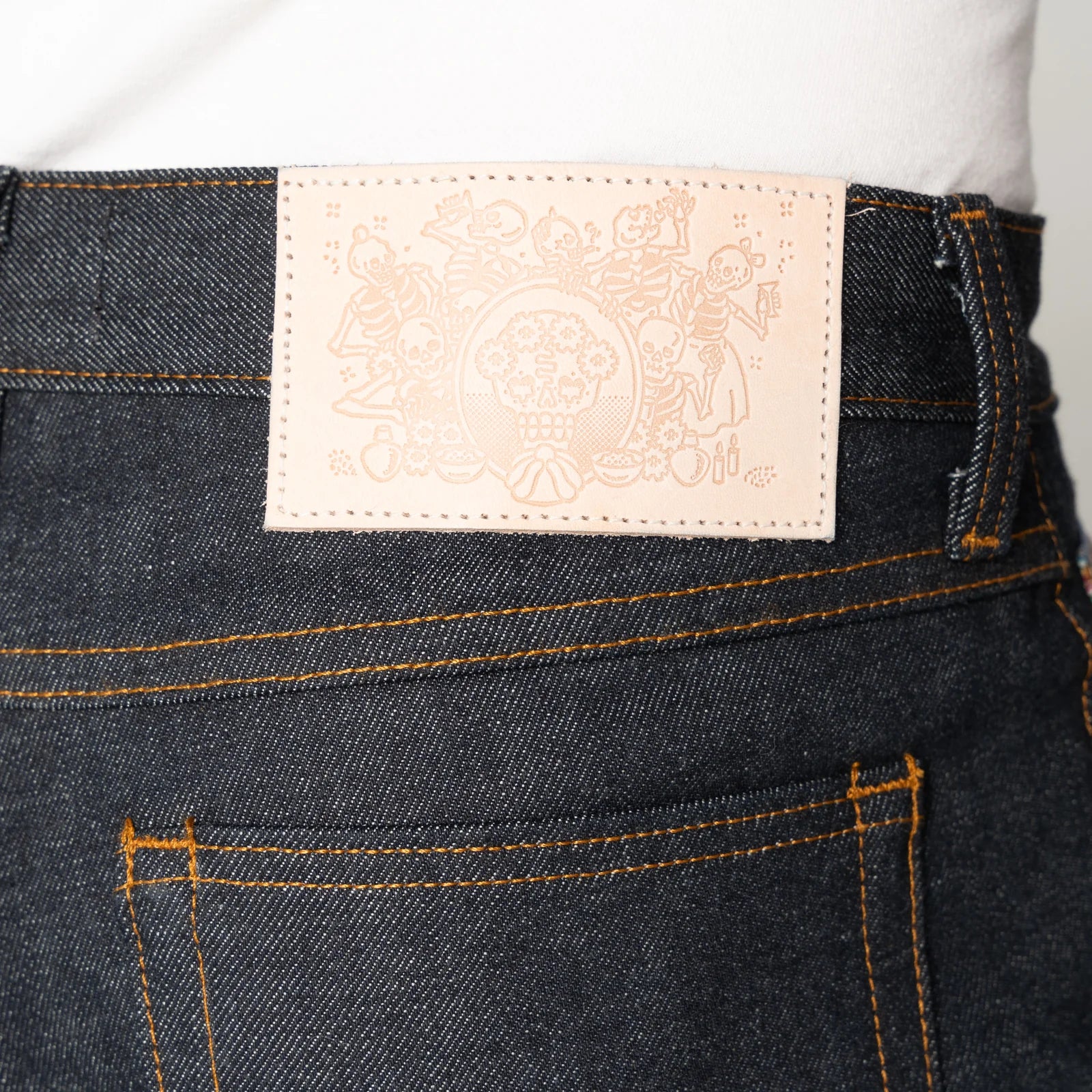 The Dia De Los Muertos Selvedge is a 12.5oz Japanese selvedge denim, intricately crafted to celebrate the vibrant Mexican 'Day of the Dead' tradition. This denim is woven on vintage shuttle looms in Okayama, Japan, using rope dyed short slub yarns. This technique imparts an uneven surface texture and color tone to the fabric, which, over time, will develop high-contrast vertical fades as the indigo fades away. In keeping with its celebration of Mexican culture, this denim is made from 100% Mexican upland cotton. The selvedge ID mirrors the colorful stripes found in traditional Mexican sarape blankets, adding a touch of authenticity and cultural homage. Furthermore, the jeans feature a vegetable-tanned leather patch and pocket flasher, beautifully embellished with artwork by José Ruiz, aka Koopa, a distinguished tattoo artist from Mexico City. His artwork, depicting skeletons adorning a traditional altar, masterfully captures the symbolic spirit of the Day of the Dead. Completing the design, the jeans are accentuated with contrast stitching, and silver metallic buttons and rivets.