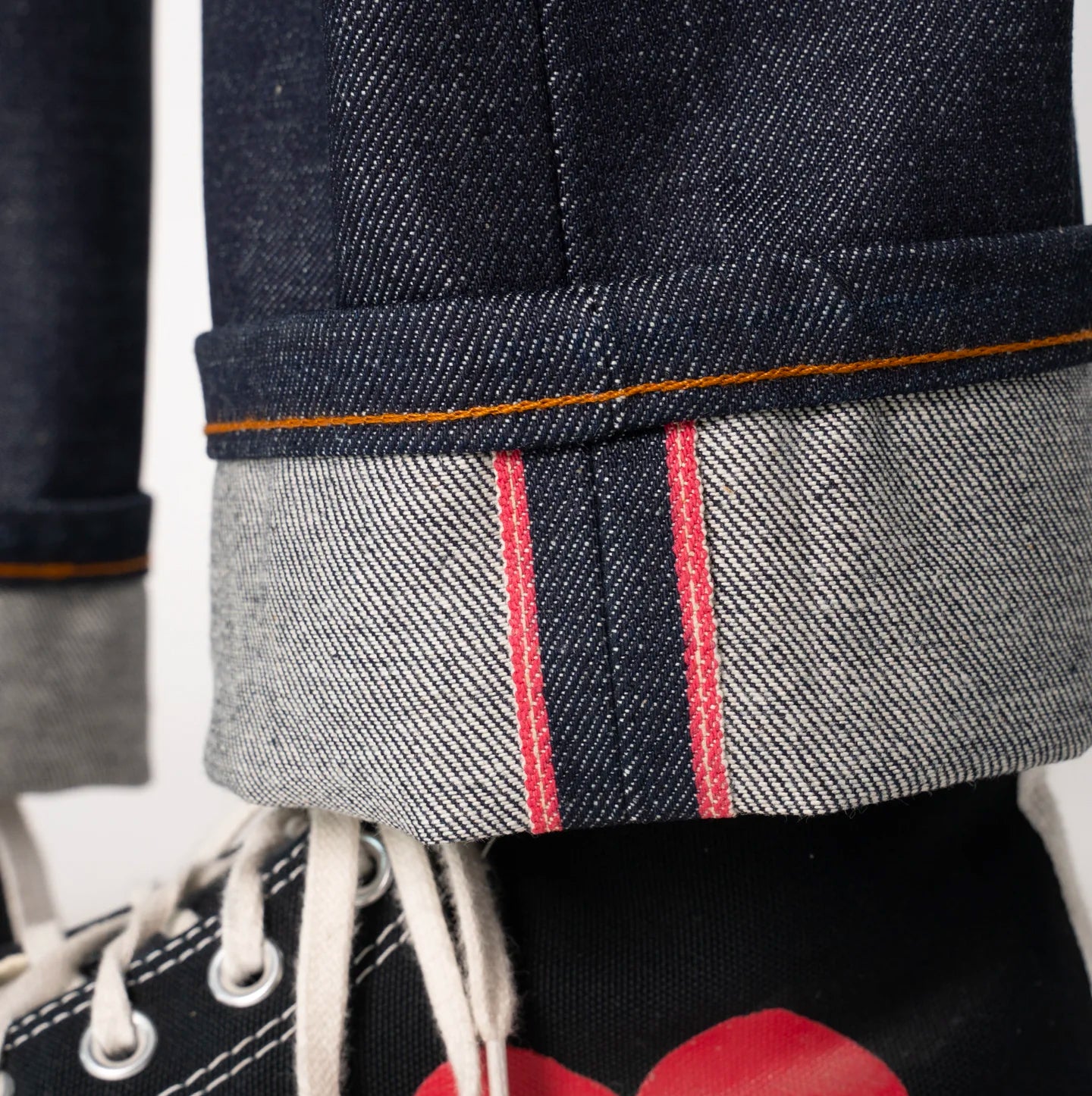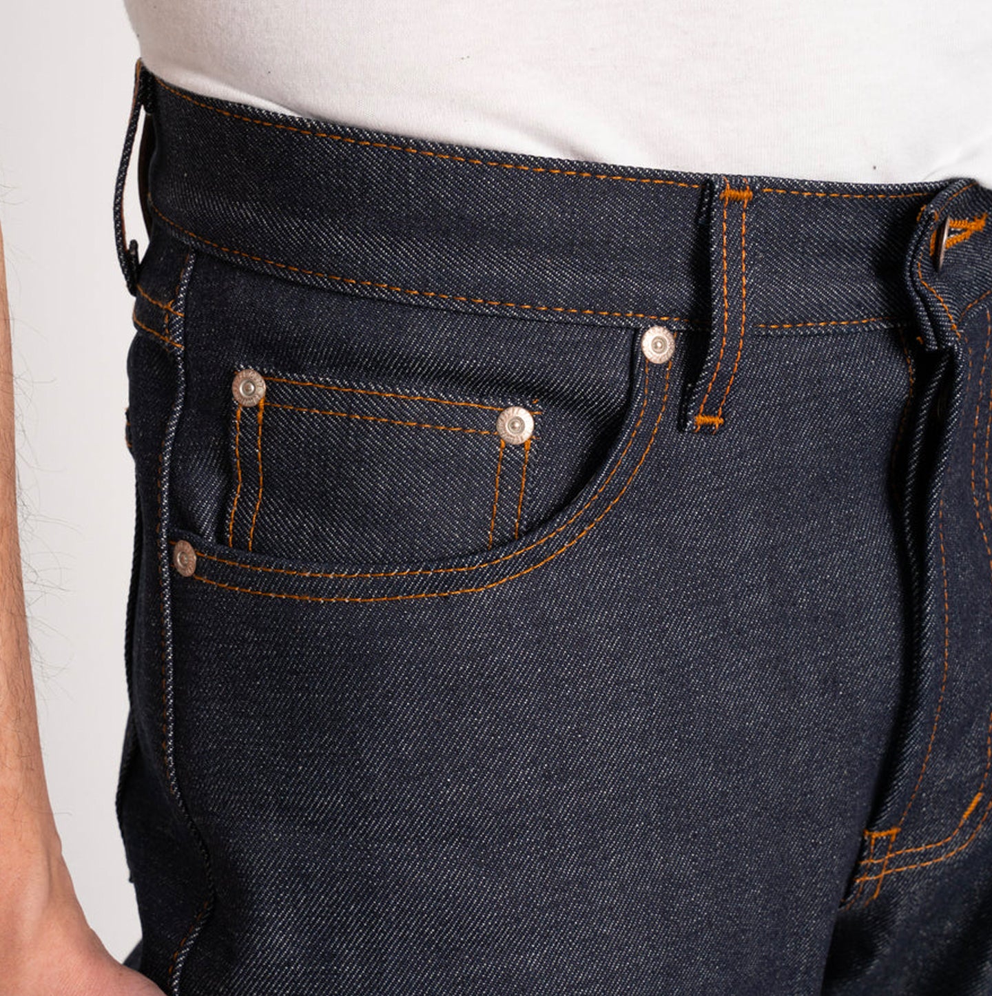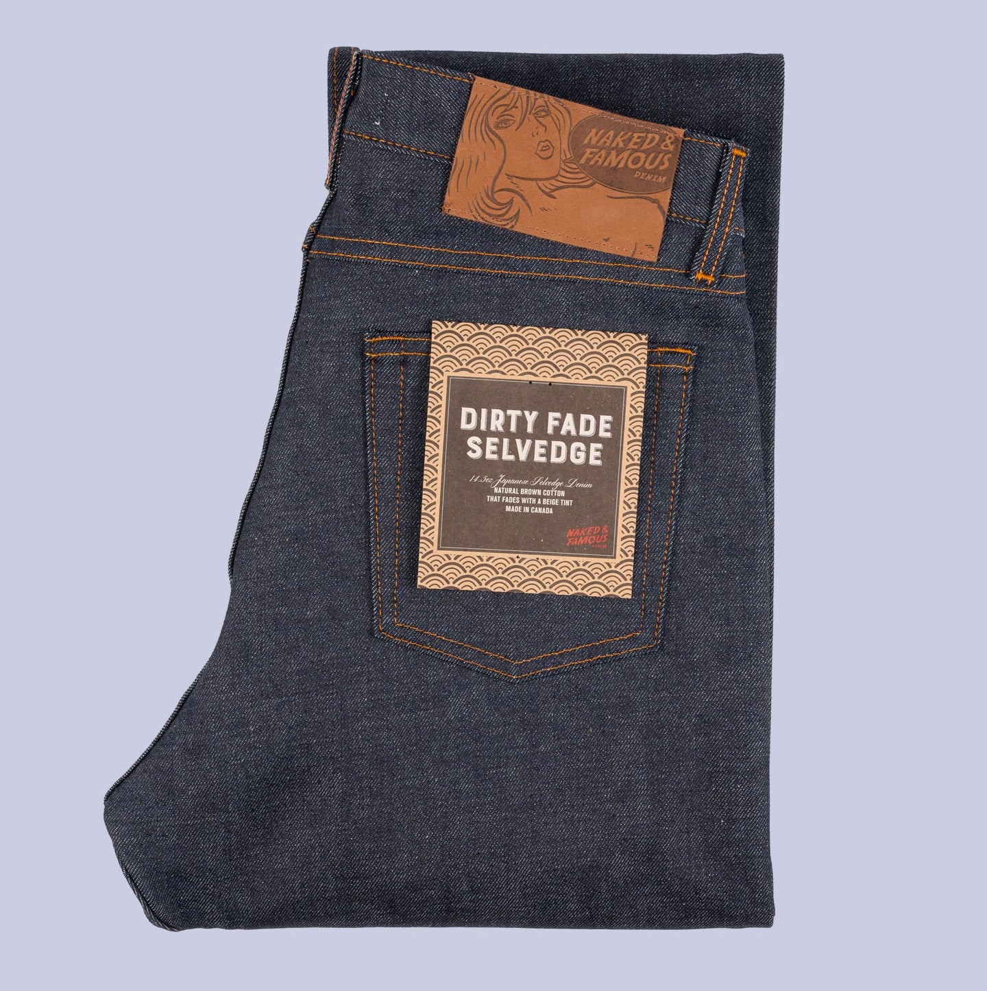 The Dirty Fade Selvedge is a 14.5oz indigo rope dyed Japanese selvedge denim, woven on vintage shuttle looms in a right hand twill construction. The indigo dyed warp yarns start off as a dusty brown shade of cotton. Over time with wear, layers of indigo will begin fade away revealing a brown undertone, hence the name Dirty Fade. Other details include contrast stitching, roughout tan leather patch, red selvedge ID, silver metallic buttons and rivets.