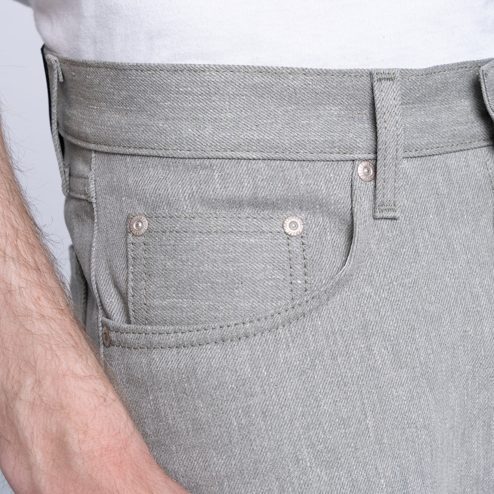 The Meteor Selvedge is a specially crafted 11oz 100% Cotton Japanese selvedge denim, featuring grey mélange yarns in both the exterior warp and interior weft. These mélange yarns, a blend of dyed and undyed fibers, create a fabric with a distinctive and varied heathered appearance, a look unachievable through dyeing alone. It offers the crisp feel characteristic of raw denim, yet its lighter weight facilitates a quick and effortless break-in period. Other details you’ll find include, an all-white selvedge ID, a matte black leather patch, and silver metallic buttons and rivets.