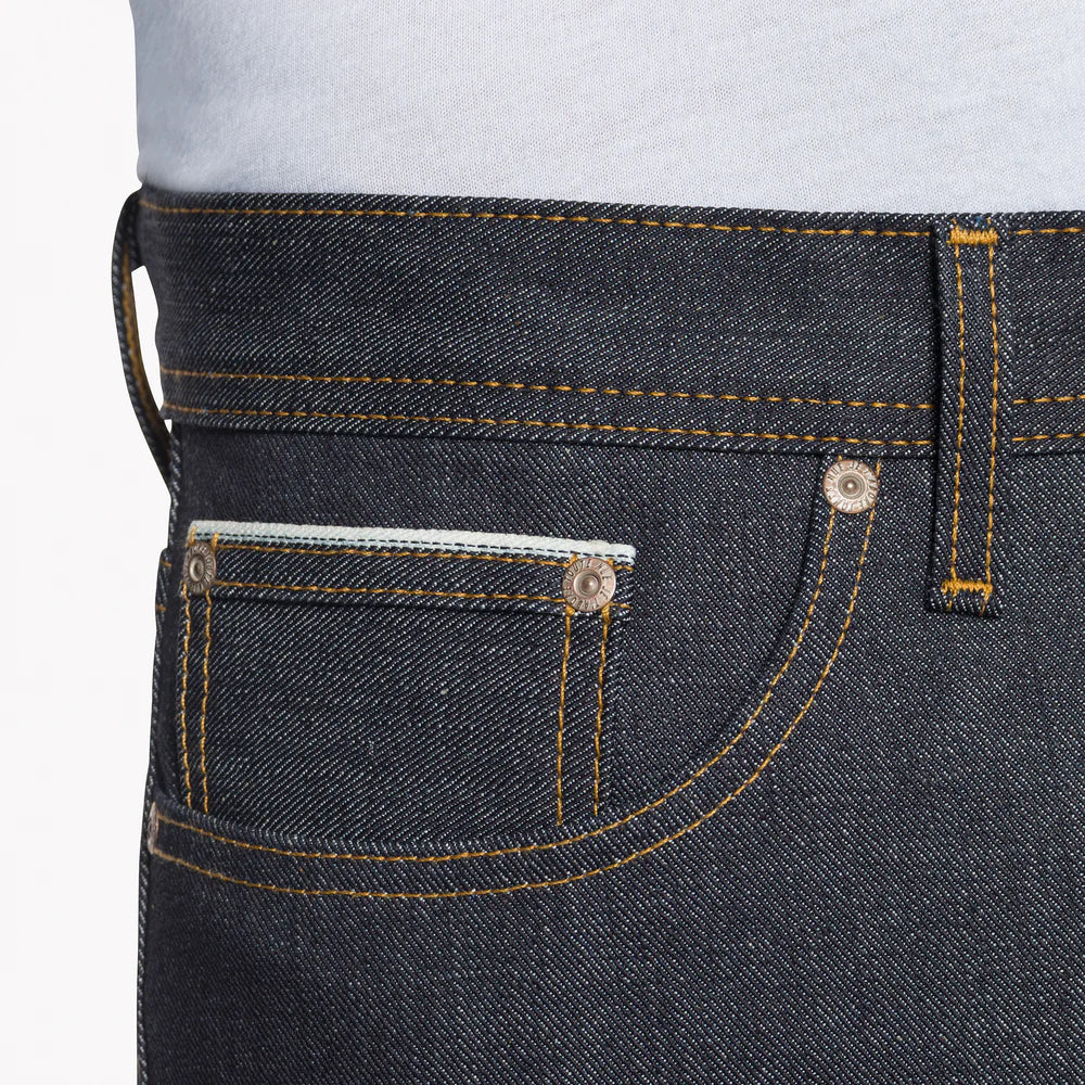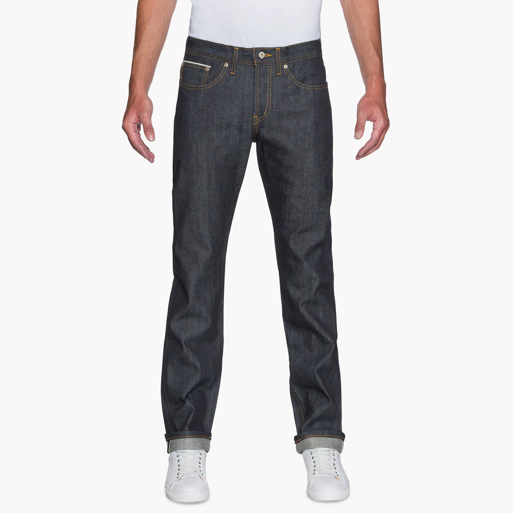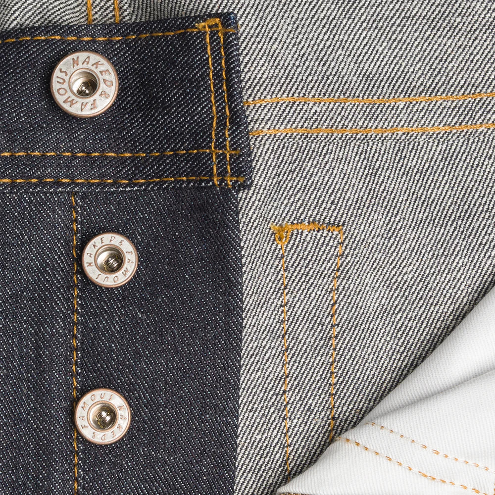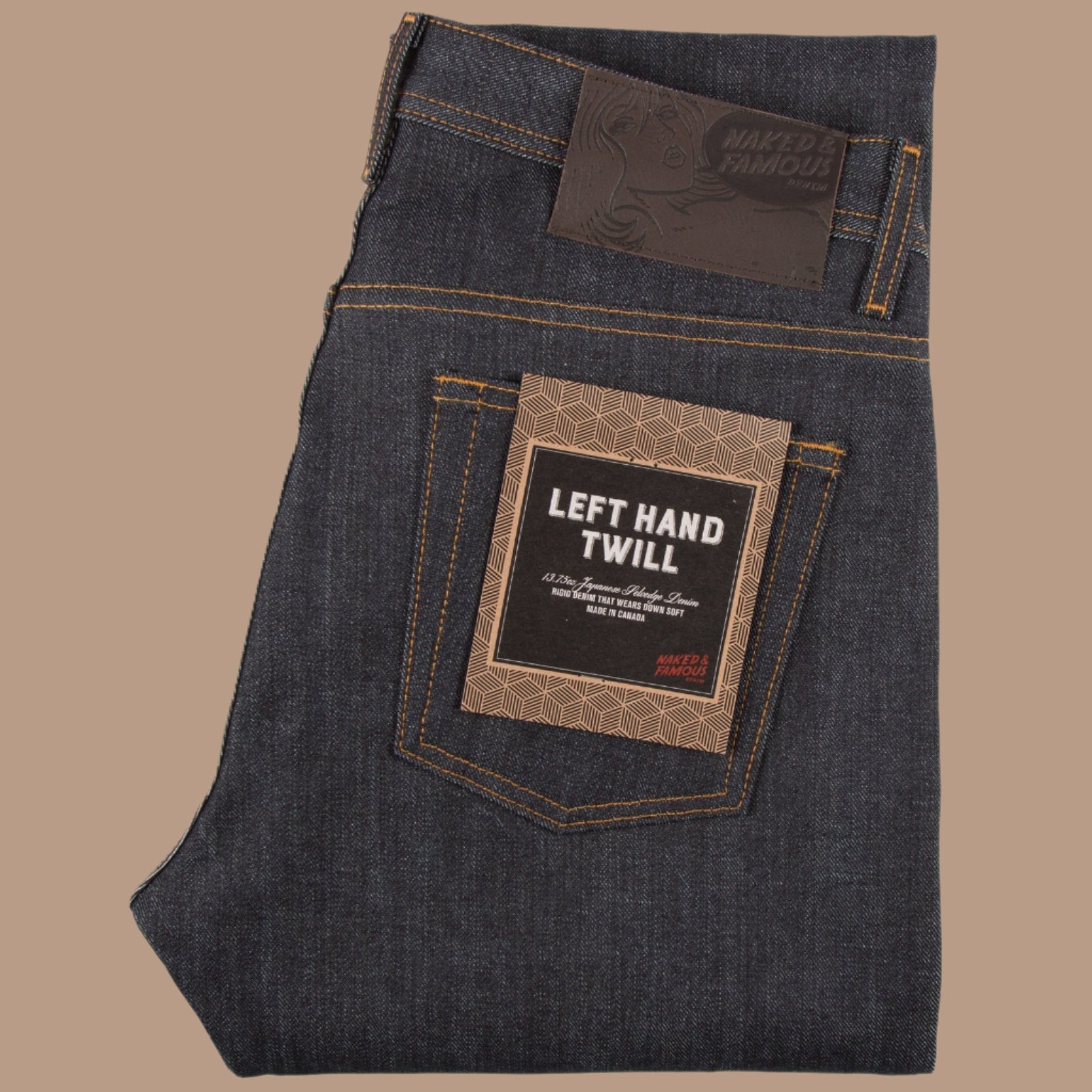 The Left Hand Twill Selvedge is a 13.75oz indigo rope dyed Japanese selvedge denim, woven on vintage shuttle looms in a left hand twill construction. When worn over time, this construction will provide a softer feeling denim and will emphasize vertical fading. Other details include contrast stitching, full grain brown leather patch, white selvedge ID, silver metallic buttons and rivets. The Weird Guy is a regular tapered fit; medium rise, standard thigh and slight taper from the knee to hem.