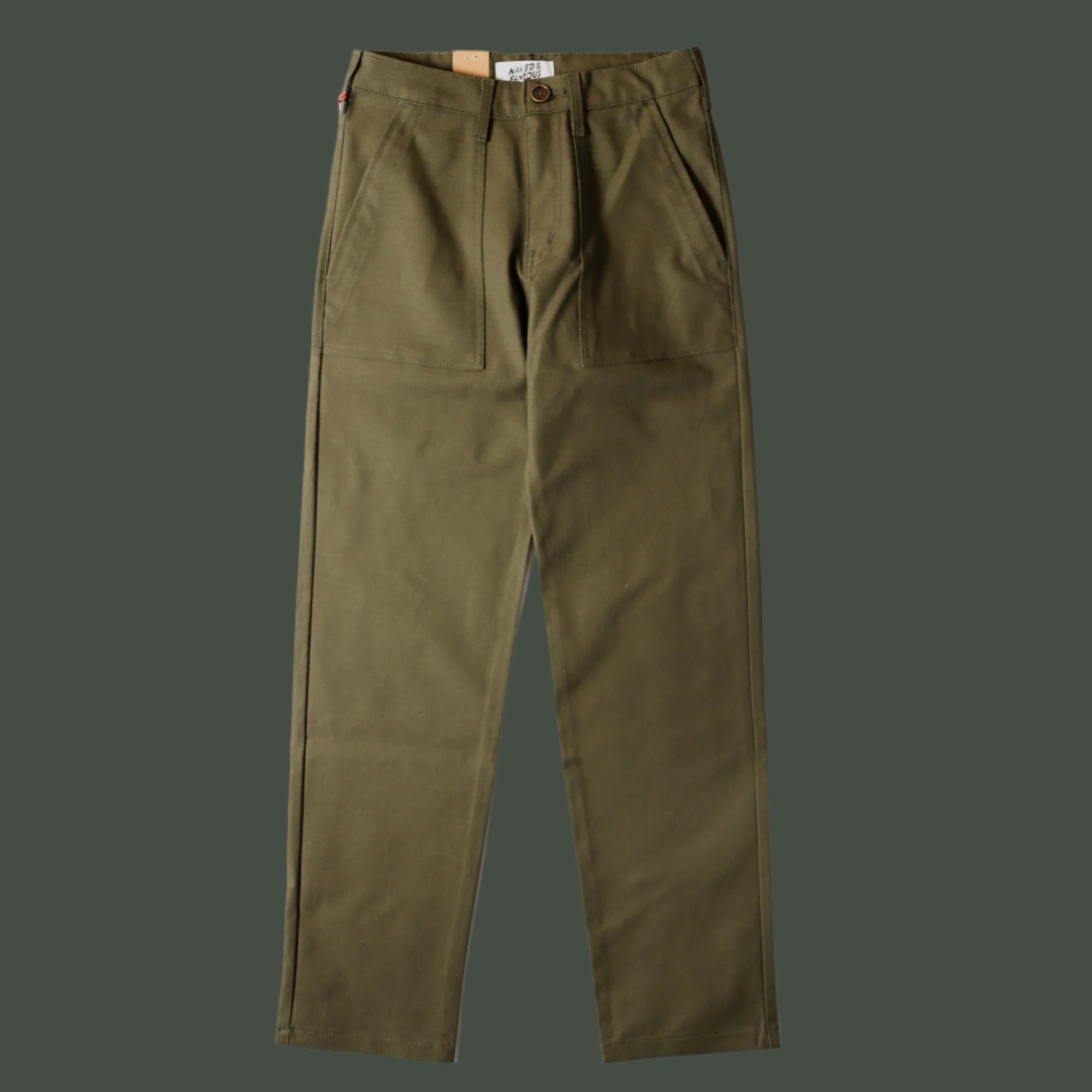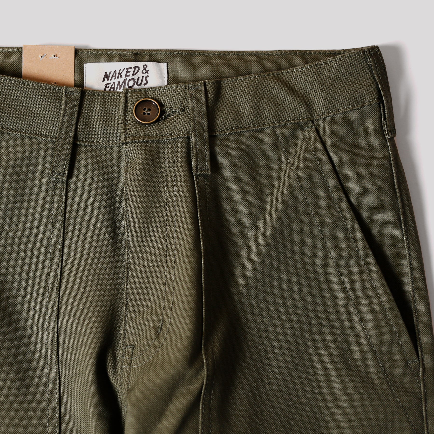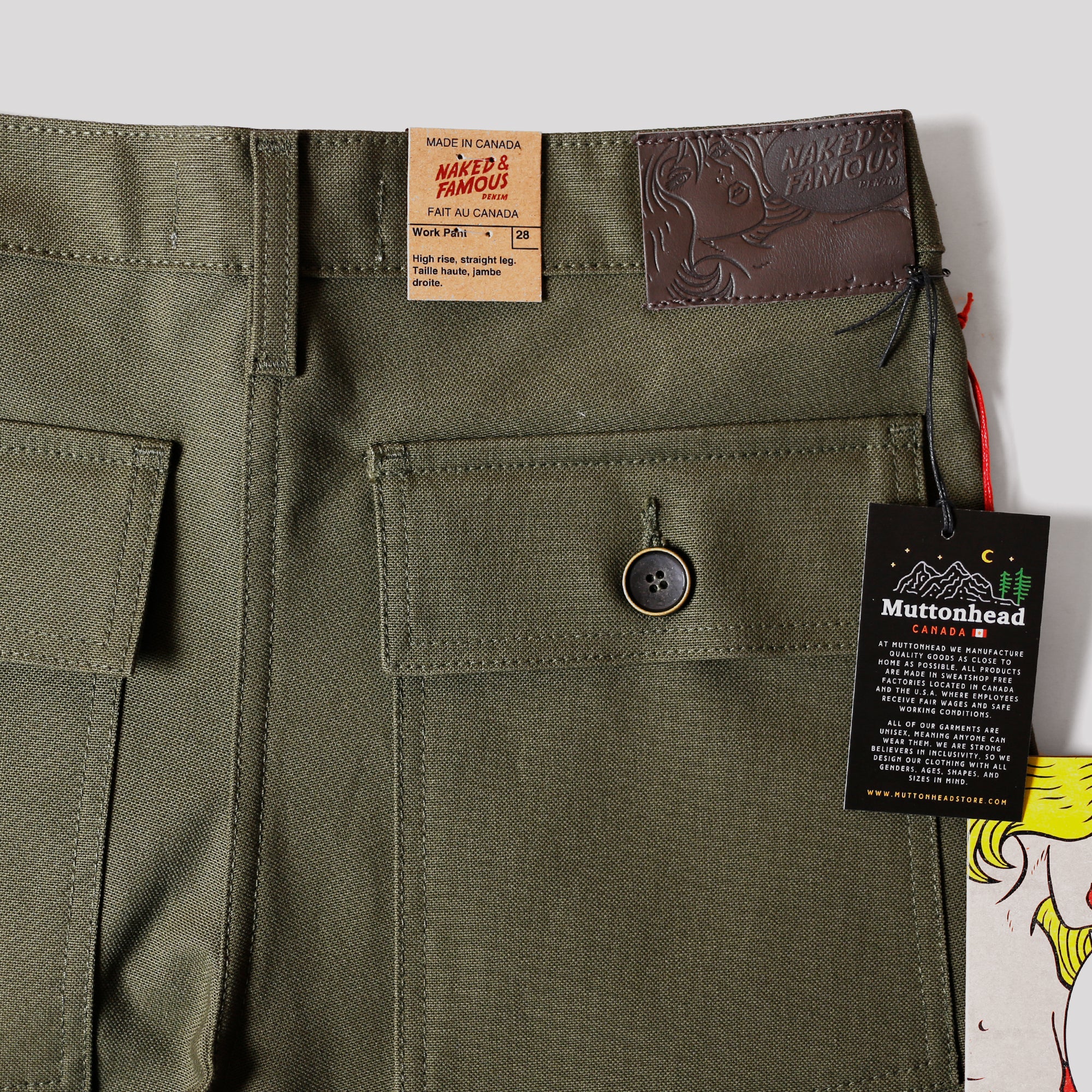 The Green Canvas is a Japanese plainweave fabric with 1% stretch for comfort. A classic utilitarian cloth, the smooth-faced canvas resists snags and tears. The Work Pant is a classic-fit trouser with a high rise, flat front pockets, large rear flap pockets, and a straight leg. Cut and sewn in Canada.